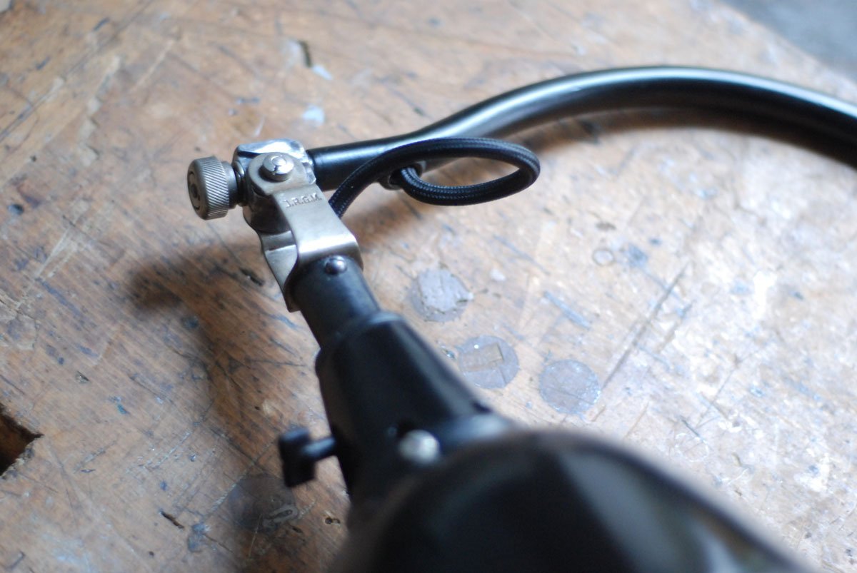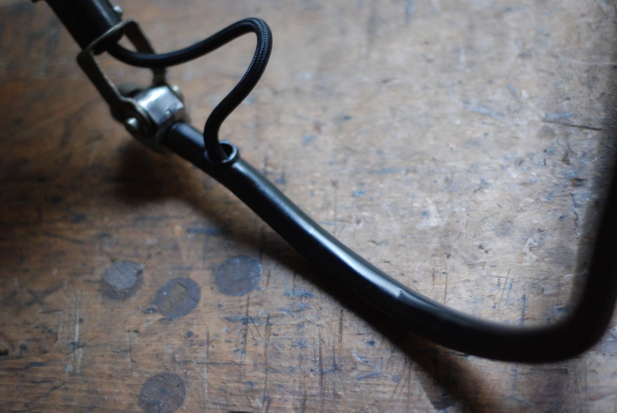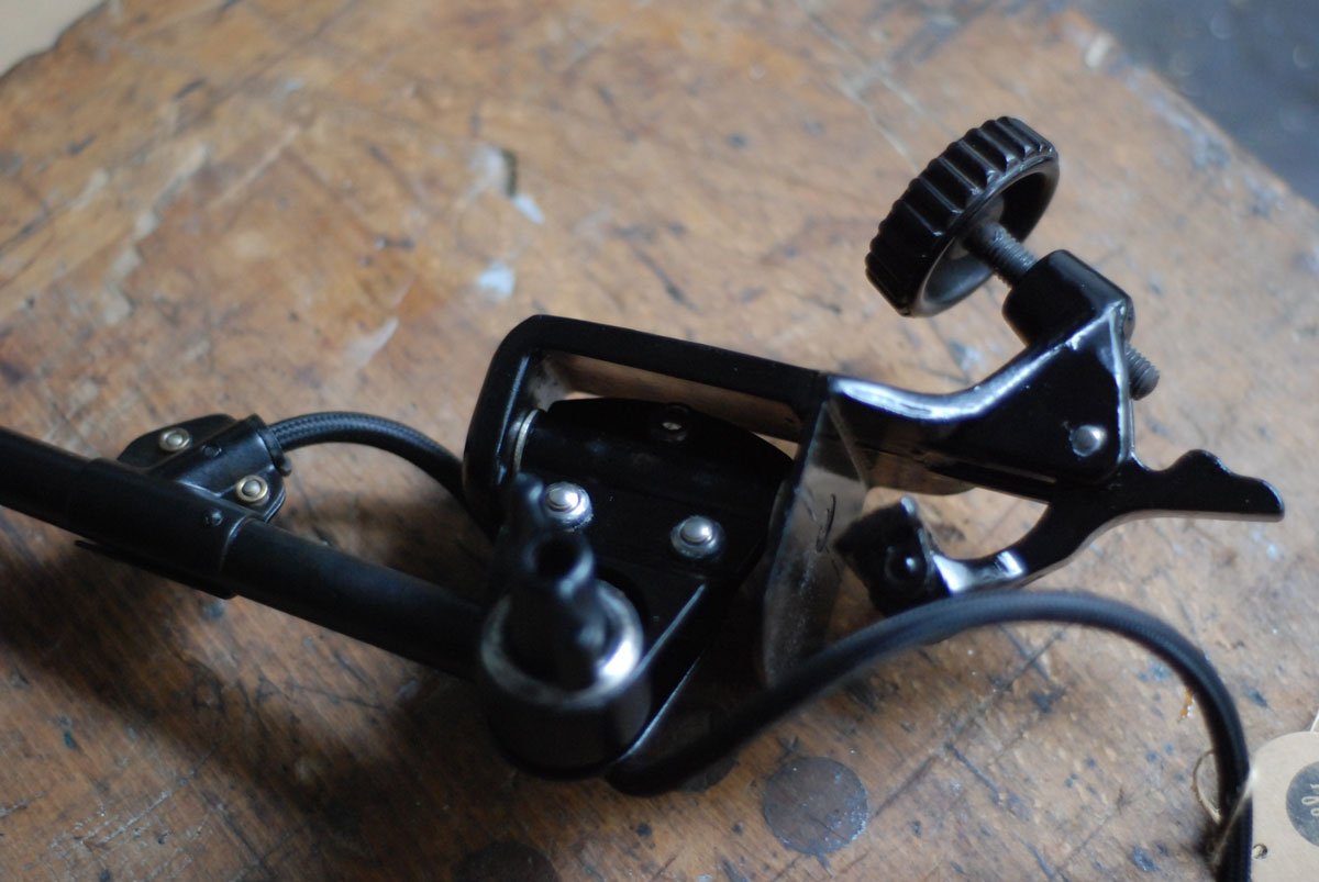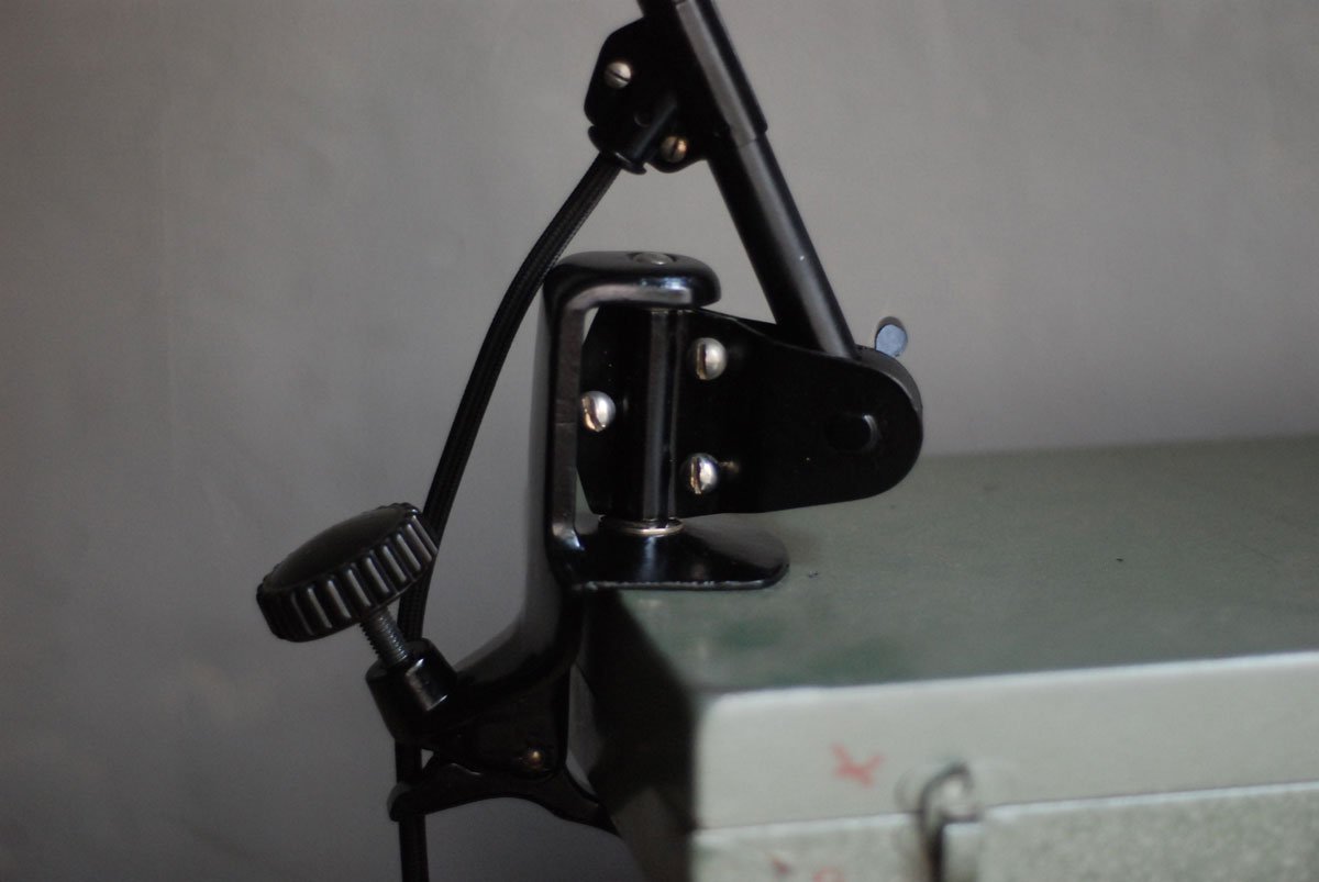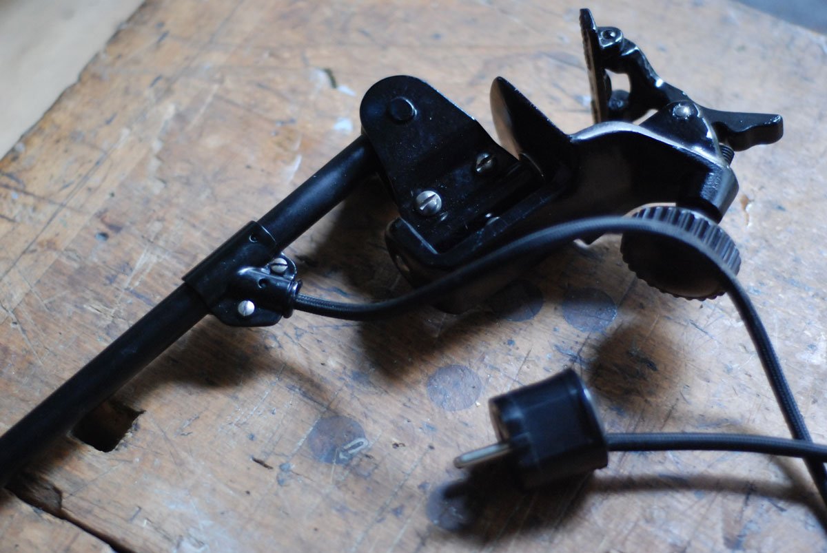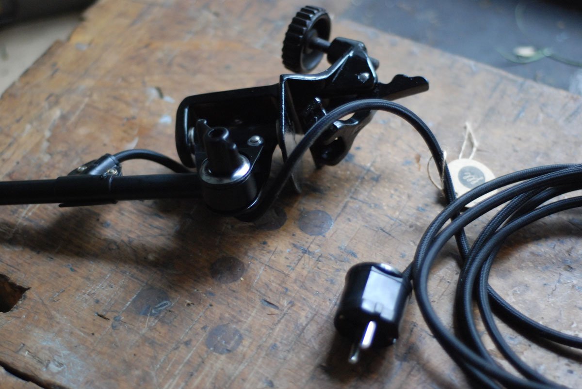 Weitere Einzelheiten entnehmen Sie bitte der ausführlichen Foto Dokumentation. Mit dem Klemmfuss kann die Leuchte an dem Tisch befestigt werden.