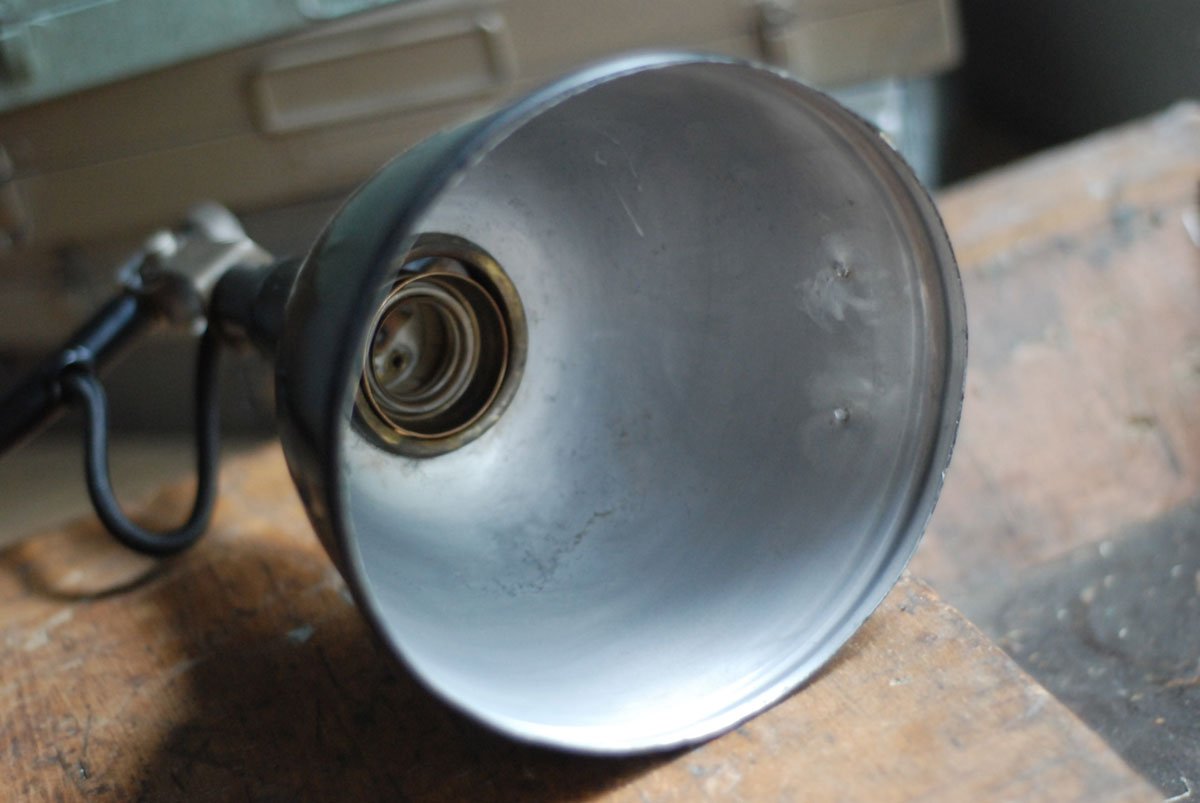 Die Leuchte wurde vollständig restauriert. Sie befindet sich in einem gebrauchten Zustand und weist Alter/Lager/Nutz spuren auf. Der Schirm hat innerlich zwei kleine Löcher, die man von Aussen nicht sieht. Der Arm ist sehr leicht gedrückt und weist zwei leichte Knicke auf, siehe Bilder.