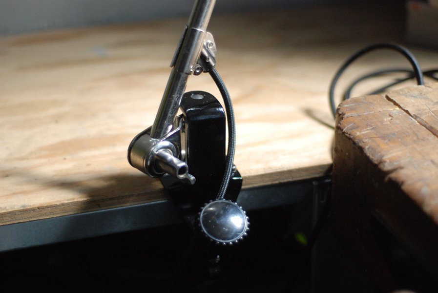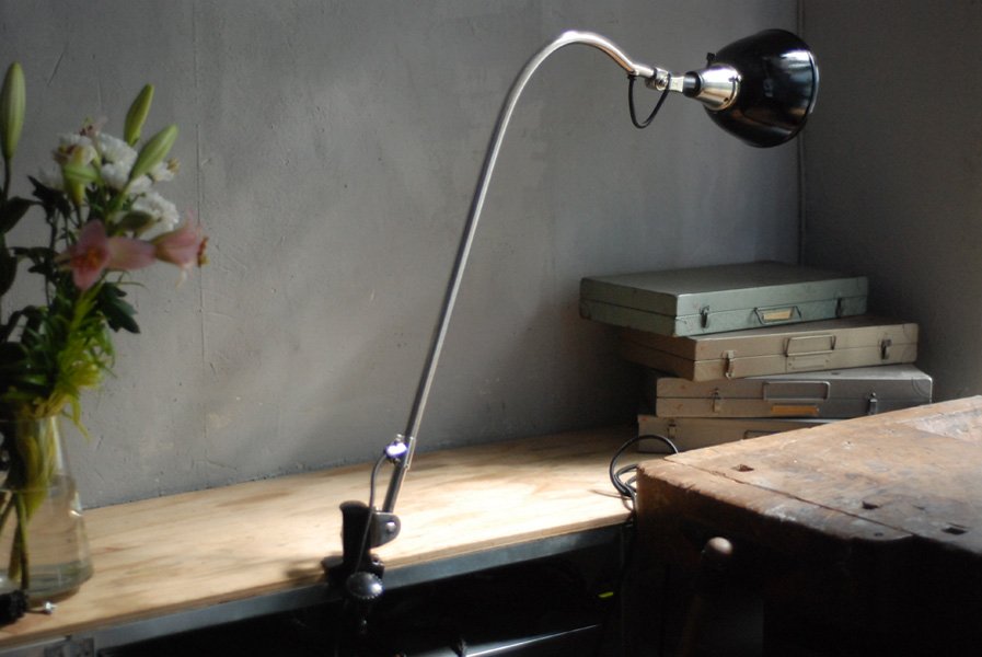 Weitere Einzelheiten entnehmen Sie bitte der ausführlichen Foto Dokumentation. Mit dem Klemmfuss kann die Leuchte an dem Tisch befestigt werden.