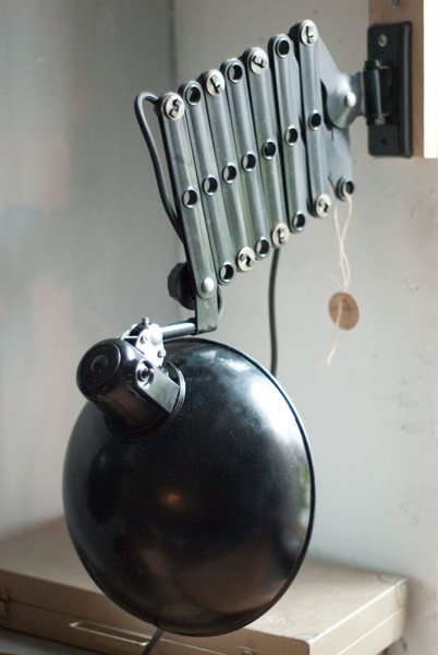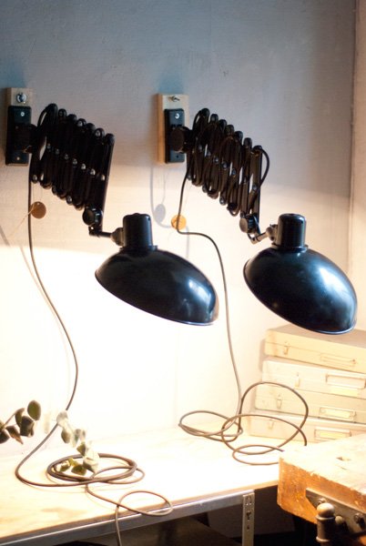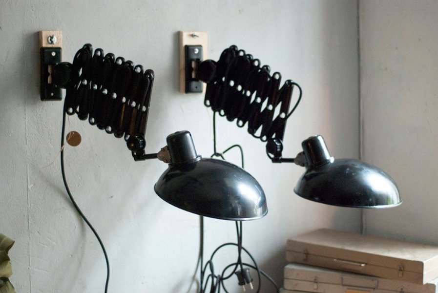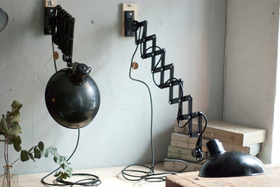 Paar von Scherenlampen Helion Arnstadt mit breiten Schirmen aus Bakelit. Nach der kompletten Zerlegung, sorgsamen Reinigung und Entrostung wurden die Elemente der Leuchten komplett entlackt, neu lackiert und zusammengebaut. Die Teile aus Bakelit wurden mit einem Hausrezept gepflegt, die Innenschirmen mit Hochtemperaturlack lackiert. Die Lampen haben dem Alter entsprechend Lager- und Gebrauchsspuren, wenige Lackabplatzer, sie…