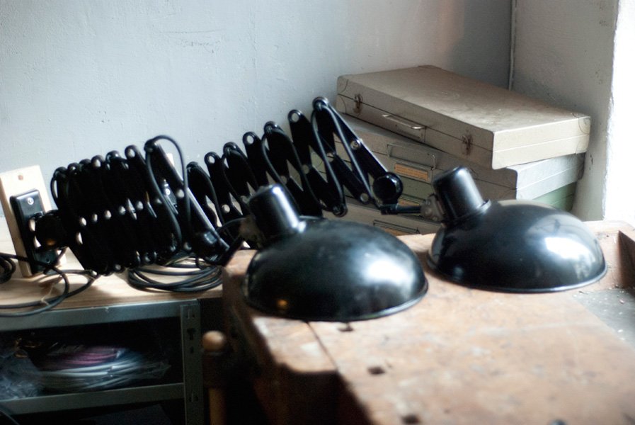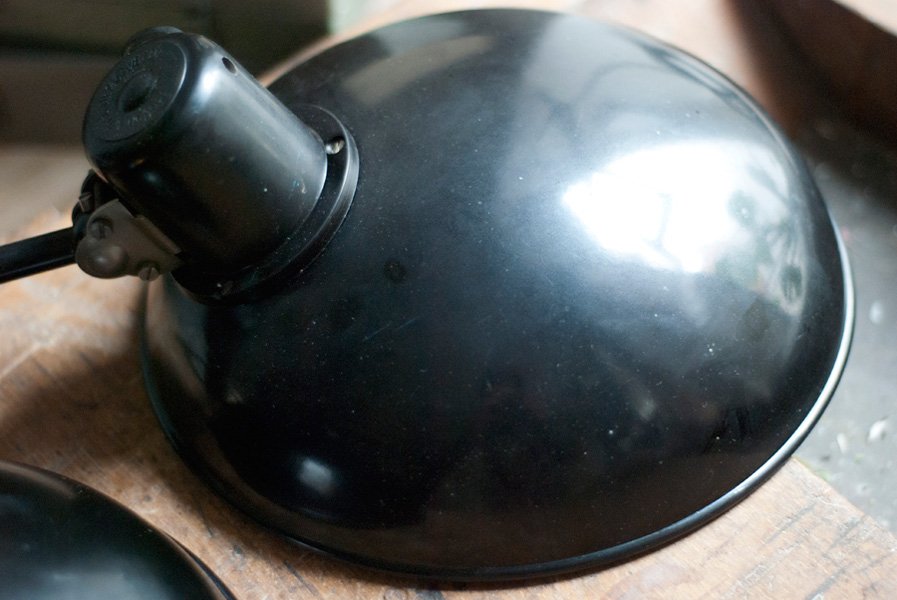 Nach der kompletten Zerlegung, sorgsamen Reinigung und Entrostung wurden die Elemente der Leuchten komplett entlackt, neu lackiert und zusammengebaut. Die Teile aus Bakelit wurden mit einem Hausrezept gepflegt, die Innenschirmen mit Hochtemperaturlack lackiert. Die Lampen haben dem Alter entsprechend Lager- und Gebrauchsspuren, wenige Lackabplatzer, sie befinden sich in einem sehr guten Zustand und haben eine schöne Patina. Ein Schirm aus Bakelit haben einen kleinen unauffälligen Riss.