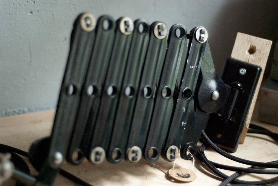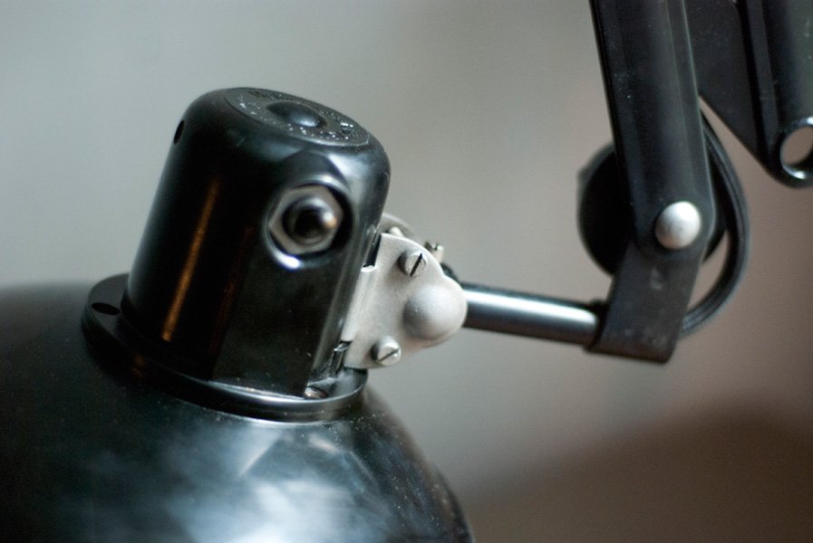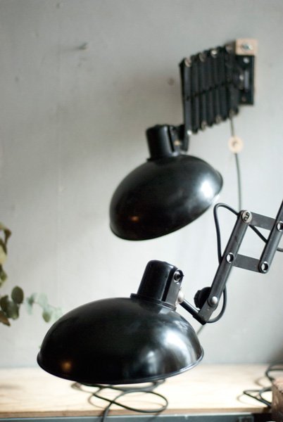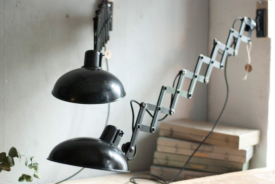 Paar von Scherenlampen Helion Arnstadt mit breiten Schirmen aus Bakelit.