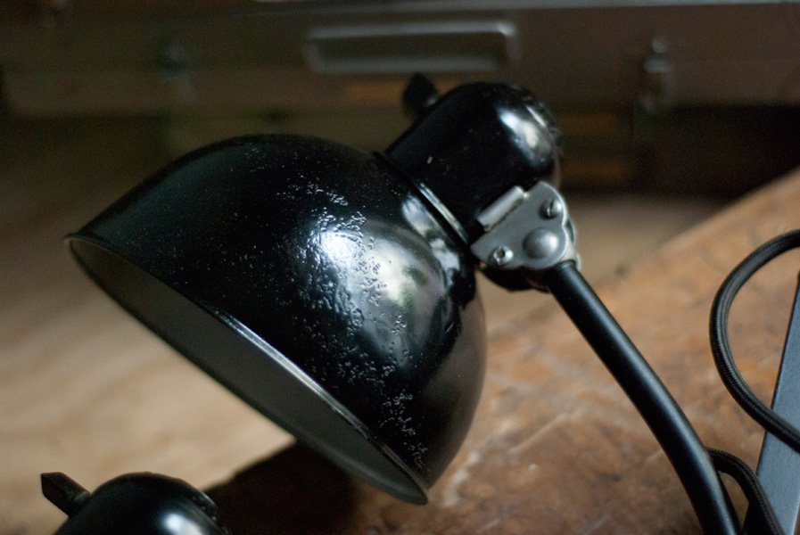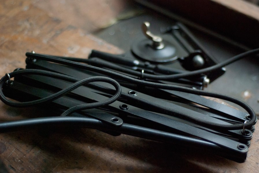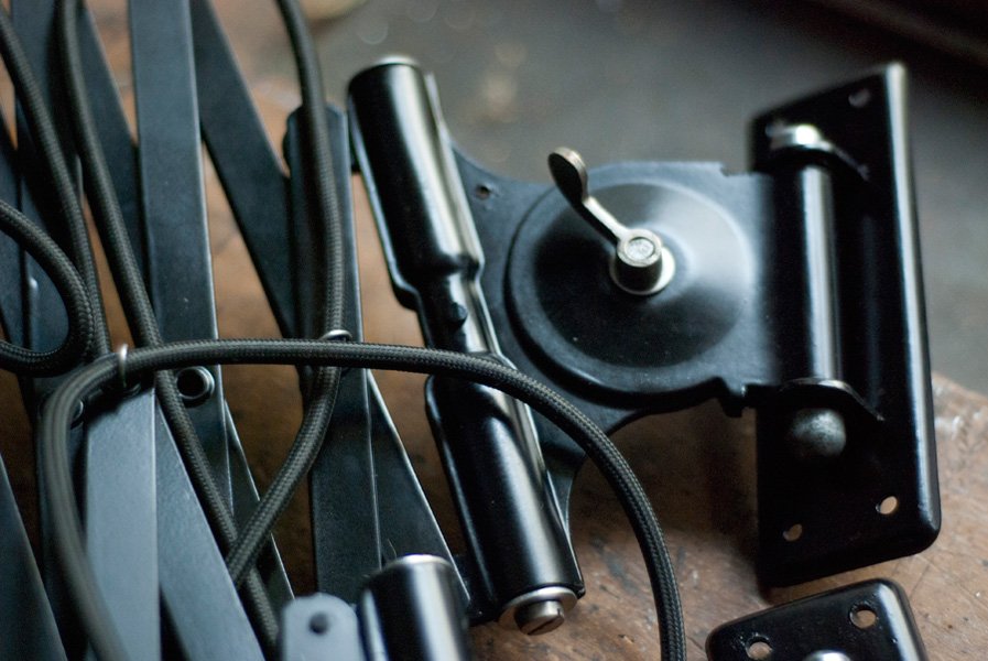 Nach der kompletten Zerlegung und sorgsamen Reinigung wurden die Elemente der Leuchten entlackt, neu lackiert und neu aufgebaut. Alle Einzelteile wurde entrostet, gereinigt, geölt.