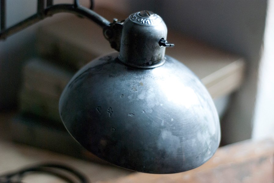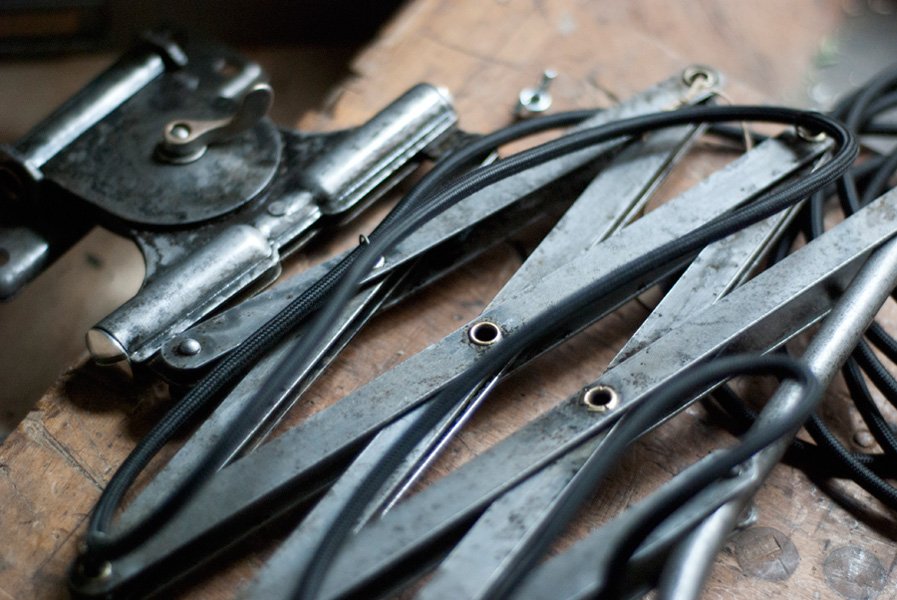 Nach der kompletten Zerlegung und sorgsamen Reinigung wurden die Elemente der Leuchte entlackt, versiegelt und neu aufgebaut.