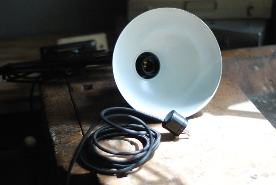 Die Elektrik wurde dreiadrig erneuert und generalüberholt. Es wurde ein schwarzes, stoffummanteltes Kabel verwendet.Die Leuchte wird mittels eines Drehschalters an der originalen Fassung betätigt.