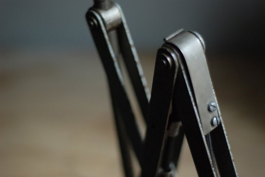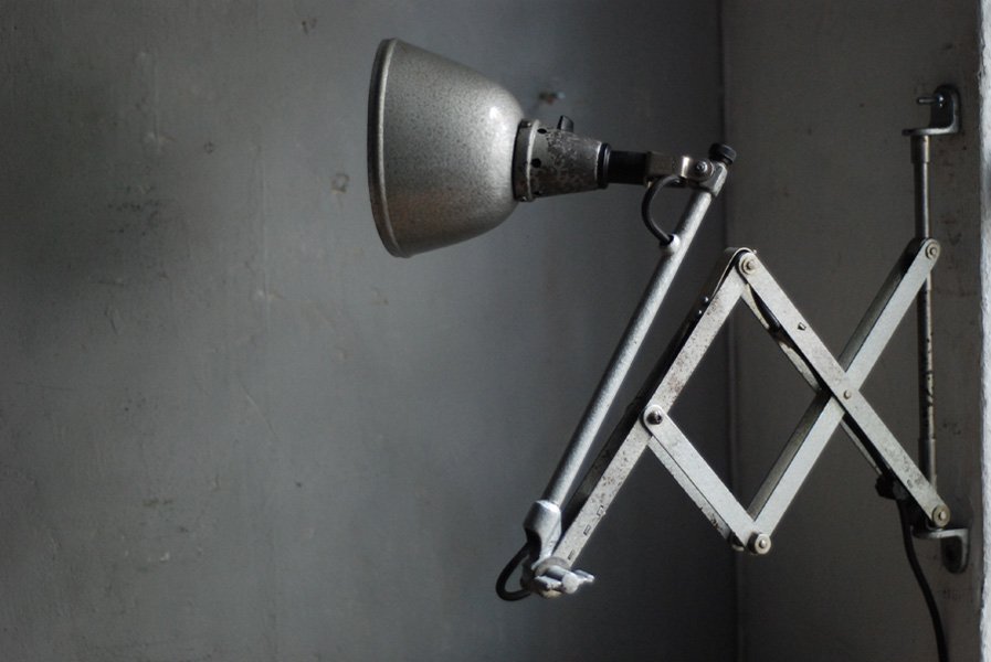 Alte Scherenlampe Midgard 110 DRGM DRP in mit hammerschlaggrauer Lackierung.