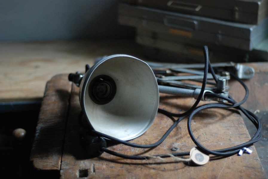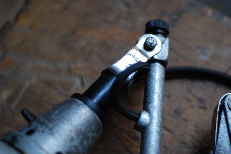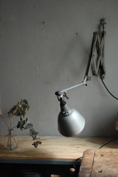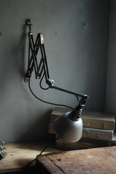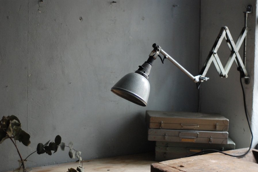 Alte Scherenlampe Midgard 110 DRGM DRP in mit hammerschlaggrauer Lackierung.