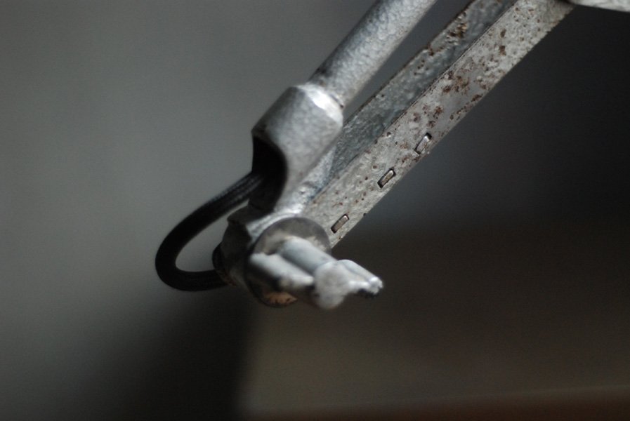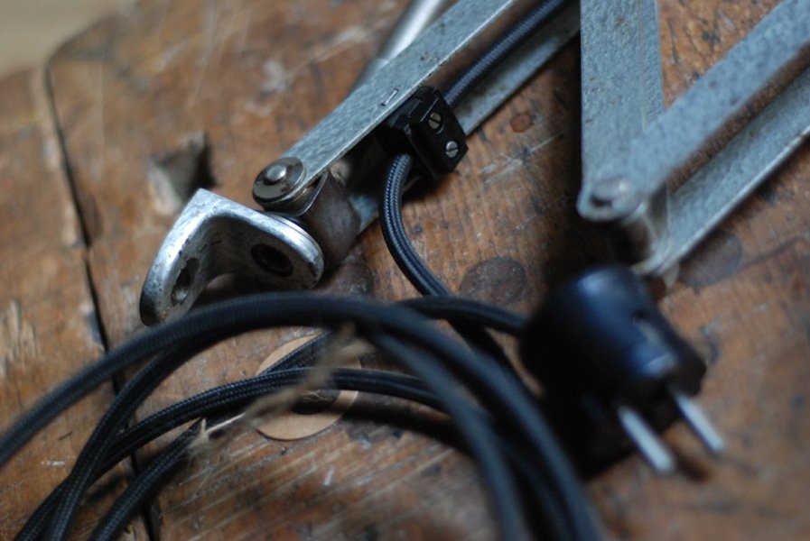 Die Elektrik wurde dreiadrig erneuert und generalüberholt. Es wurde ein schwarzes, stoffummanteltes Kabel verwendet. Die Leuchte wird mittels eines Drehschalters an der schönen originalen Messingfassung betätigt.