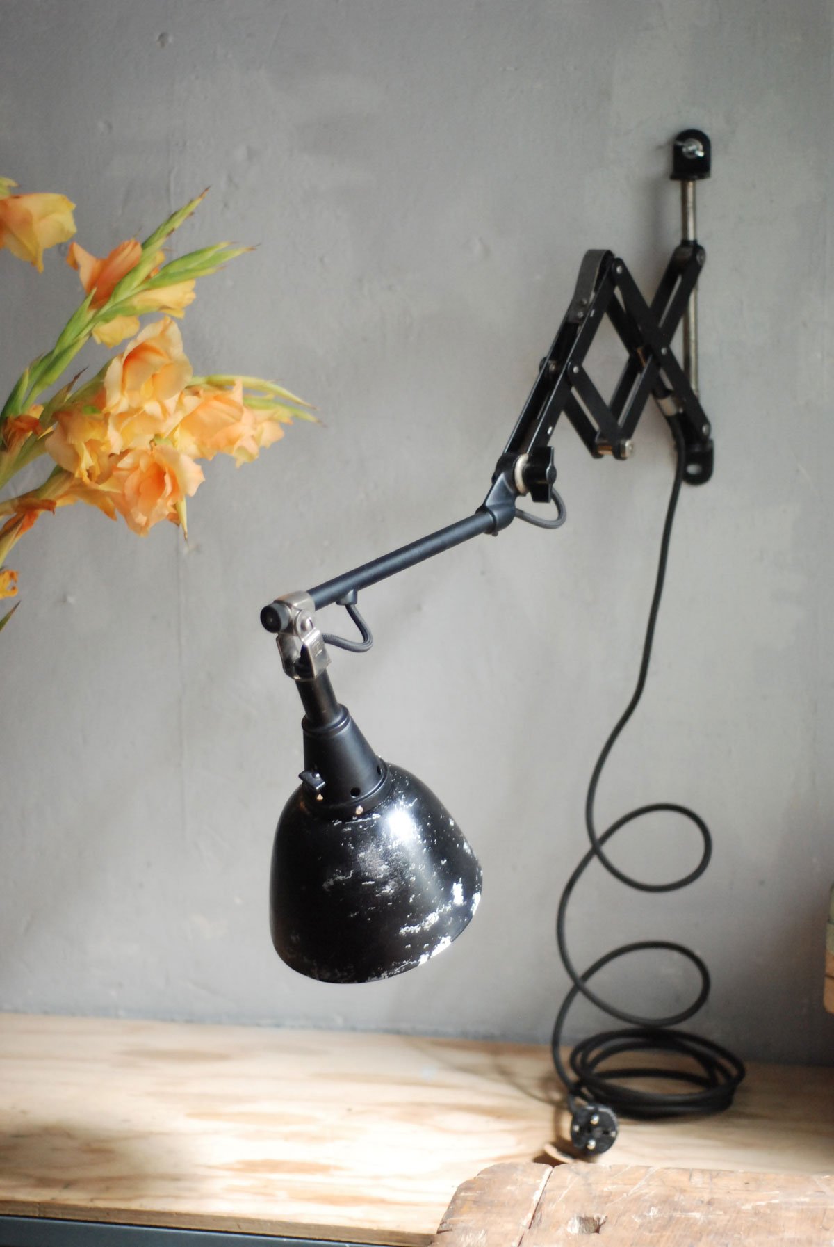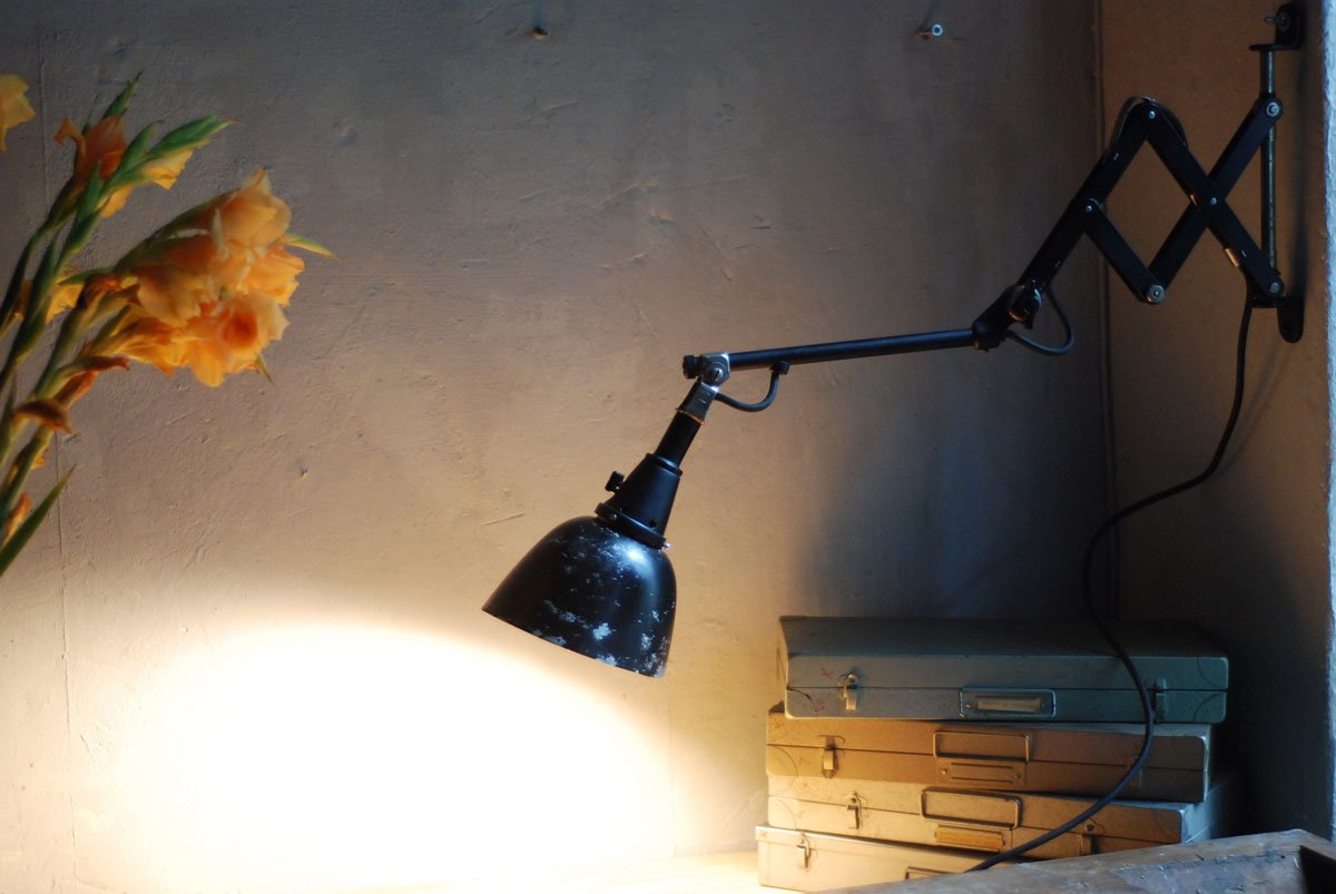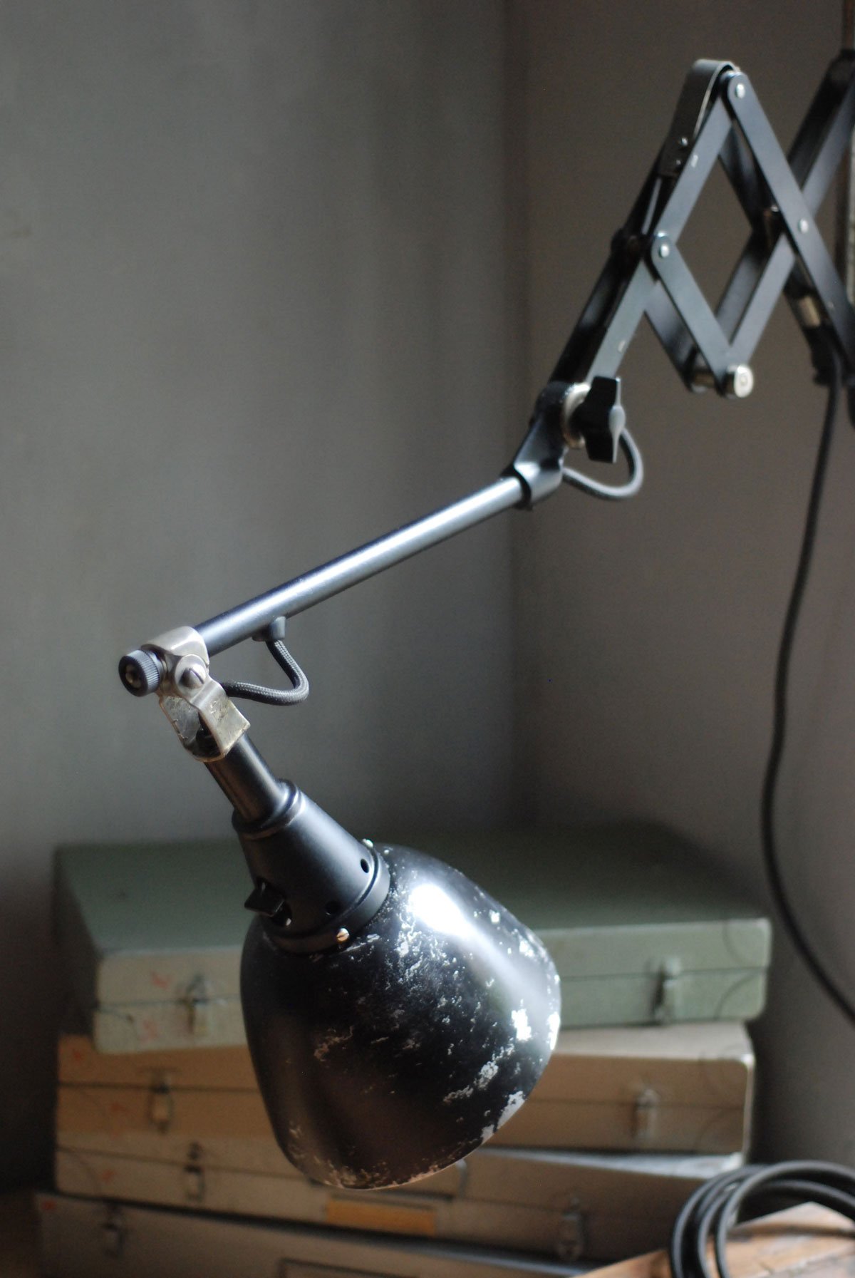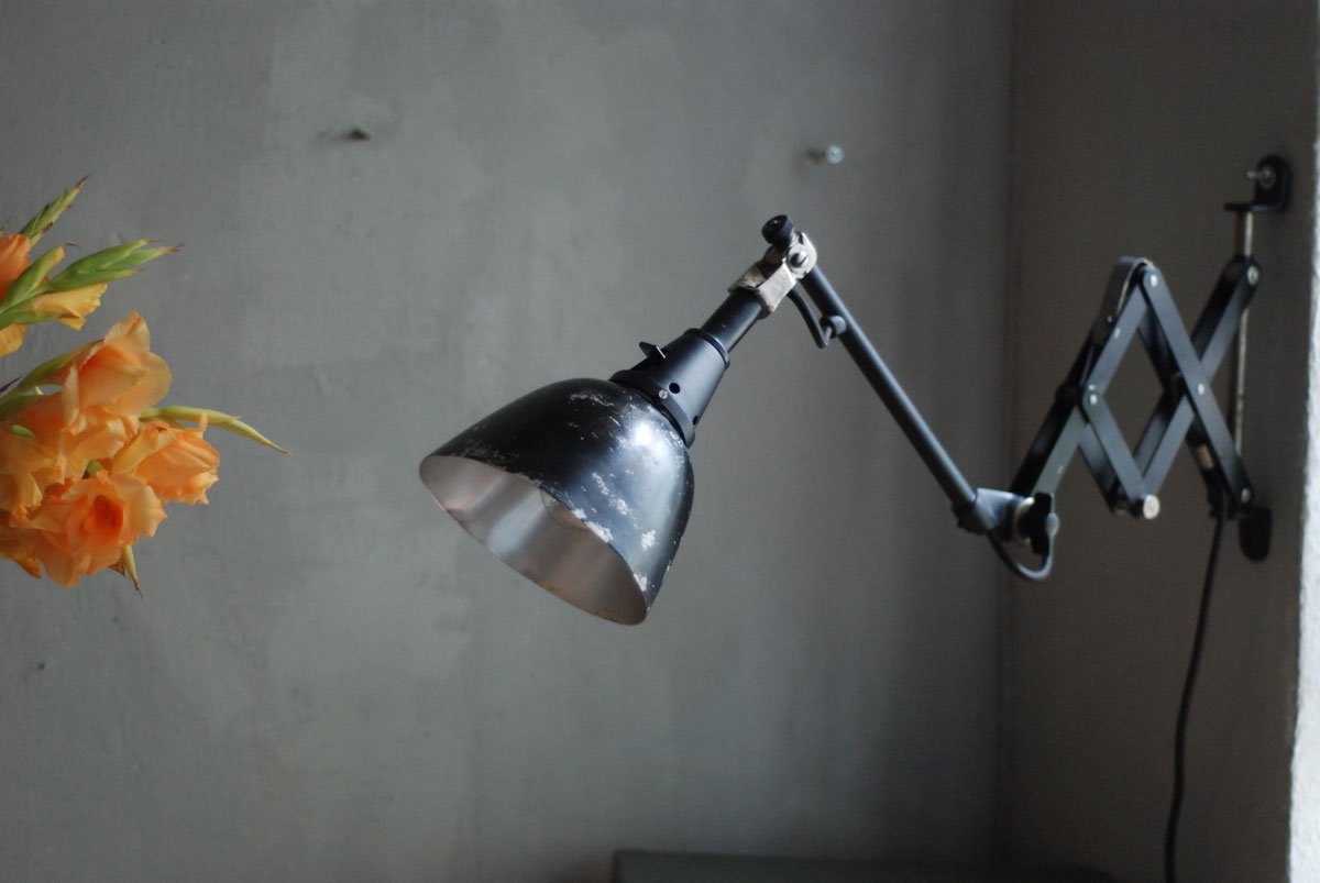 Alte Scherenlampe Midgard D.R.G.M., mod.109. mit schwarzer Lackierung und Reflektor aus Aluminium mit Patina.