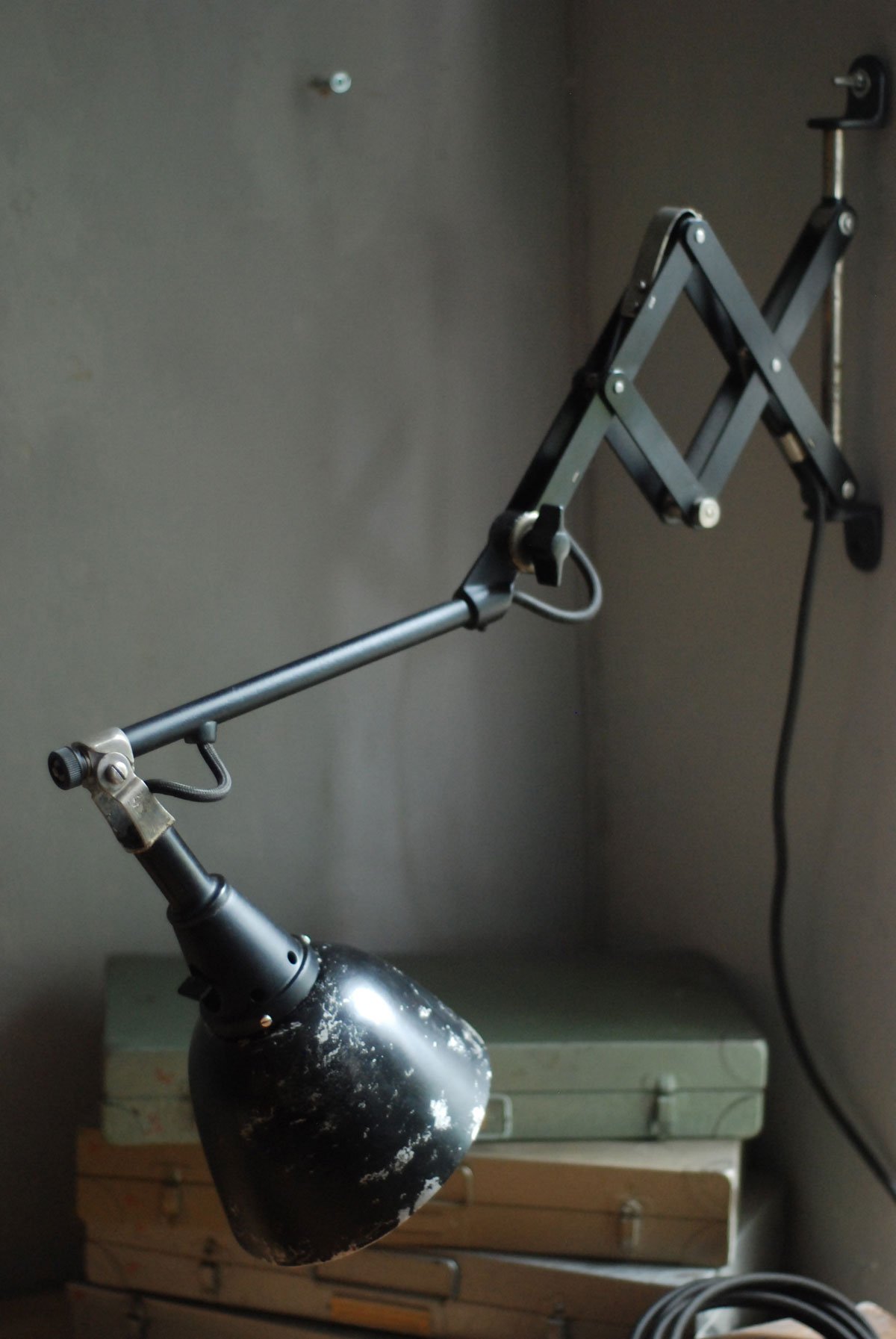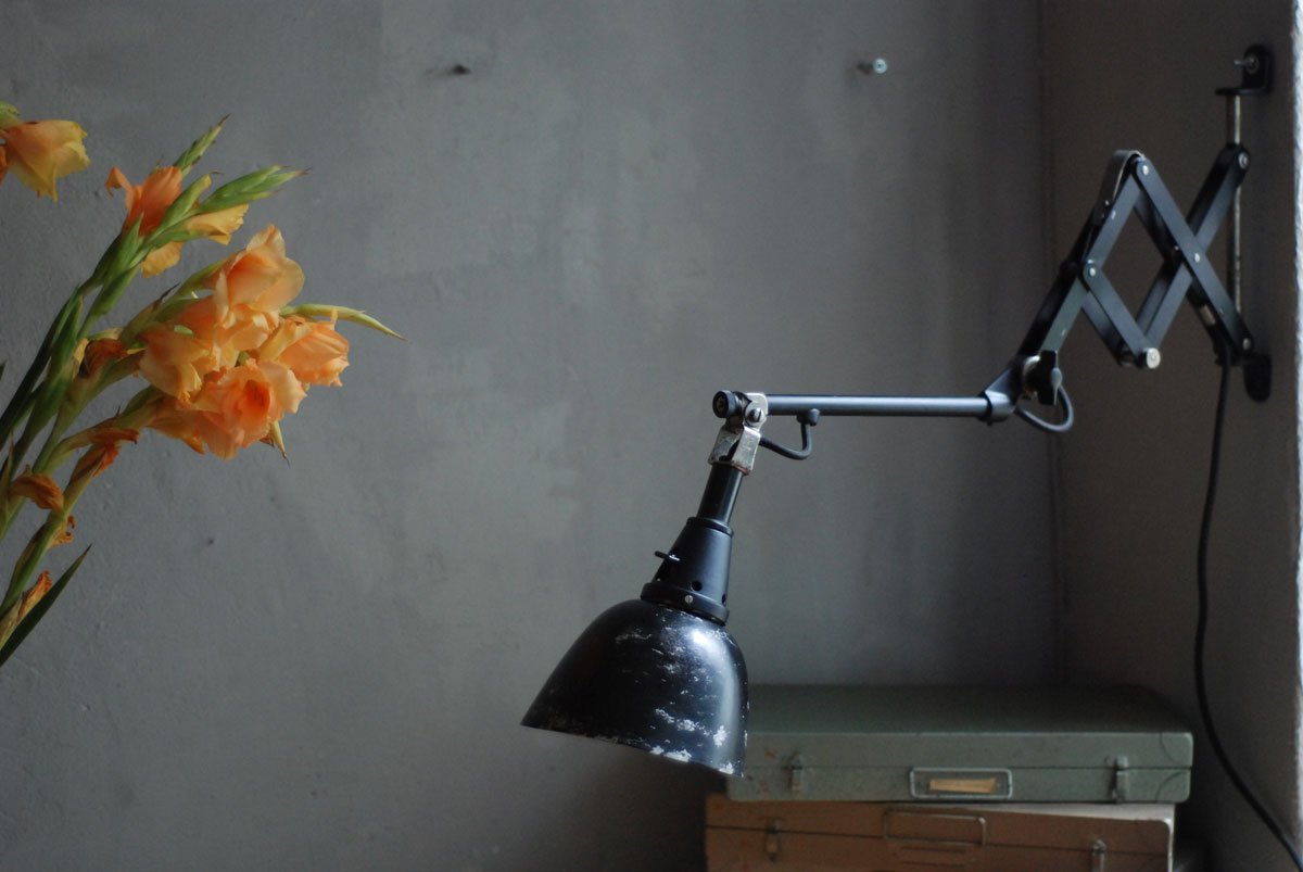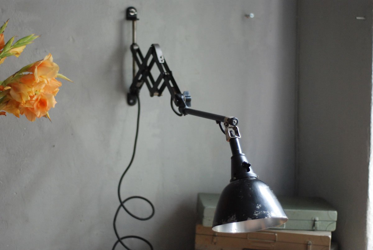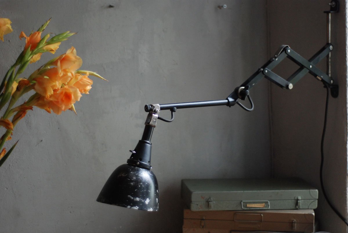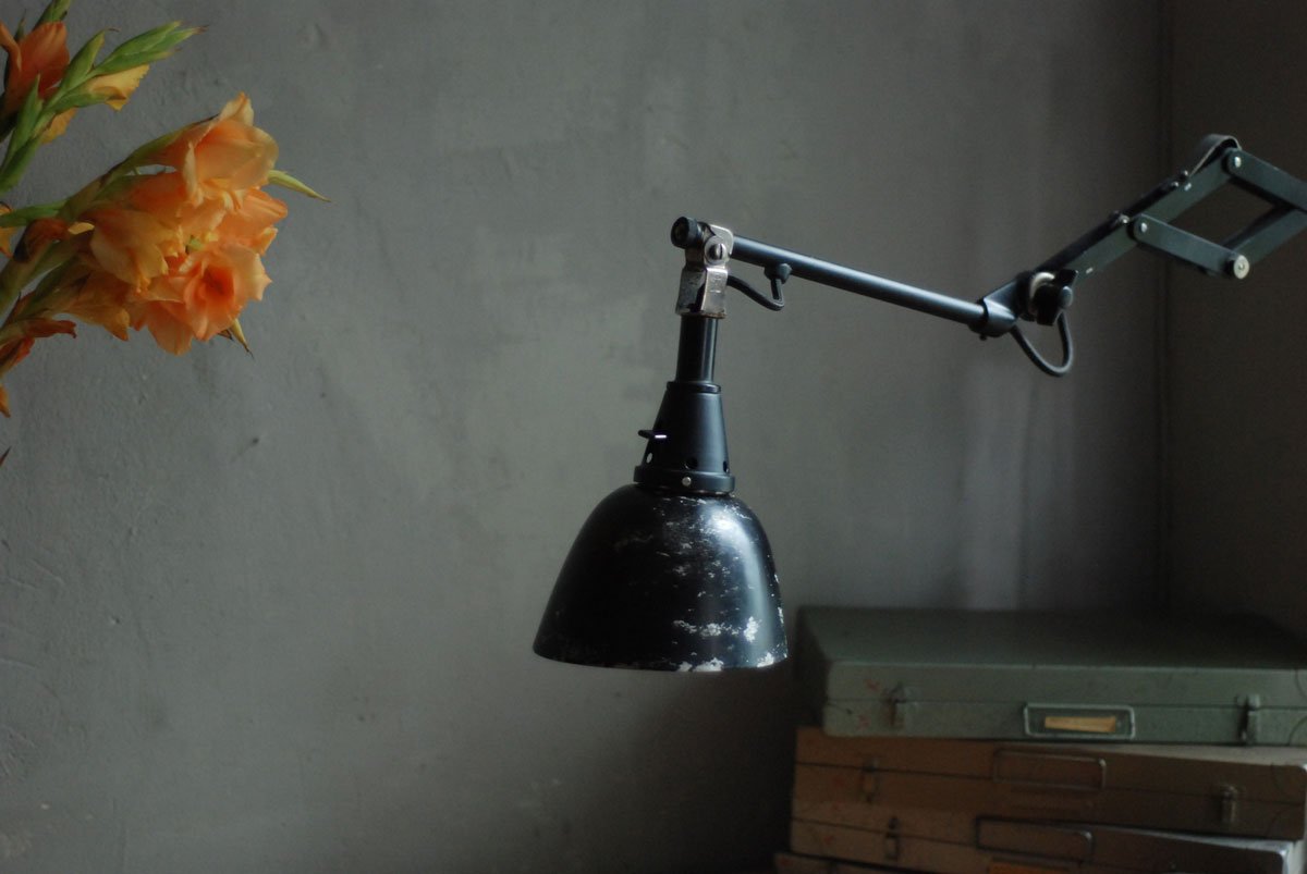 Alte Scherenlampe Midgard D.R.G.M., mod.109. mit schwarzer Lackierung und Reflektor aus Aluminium mit Patina.