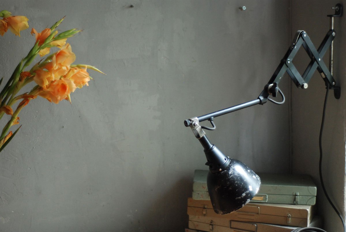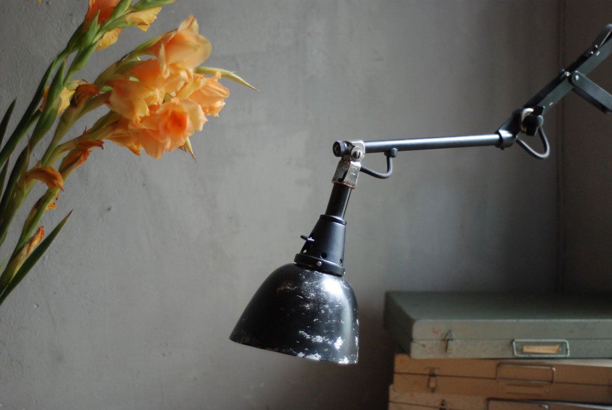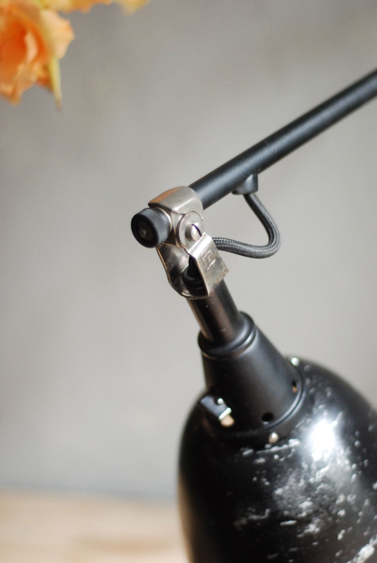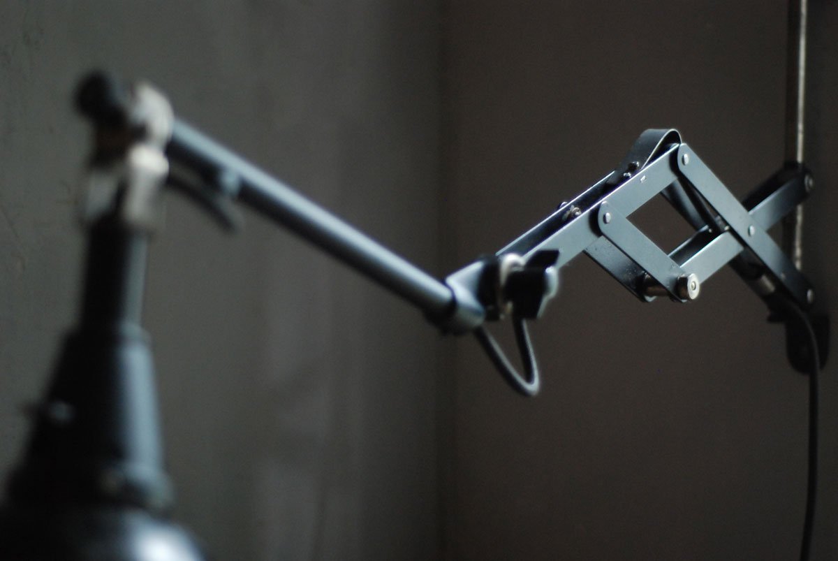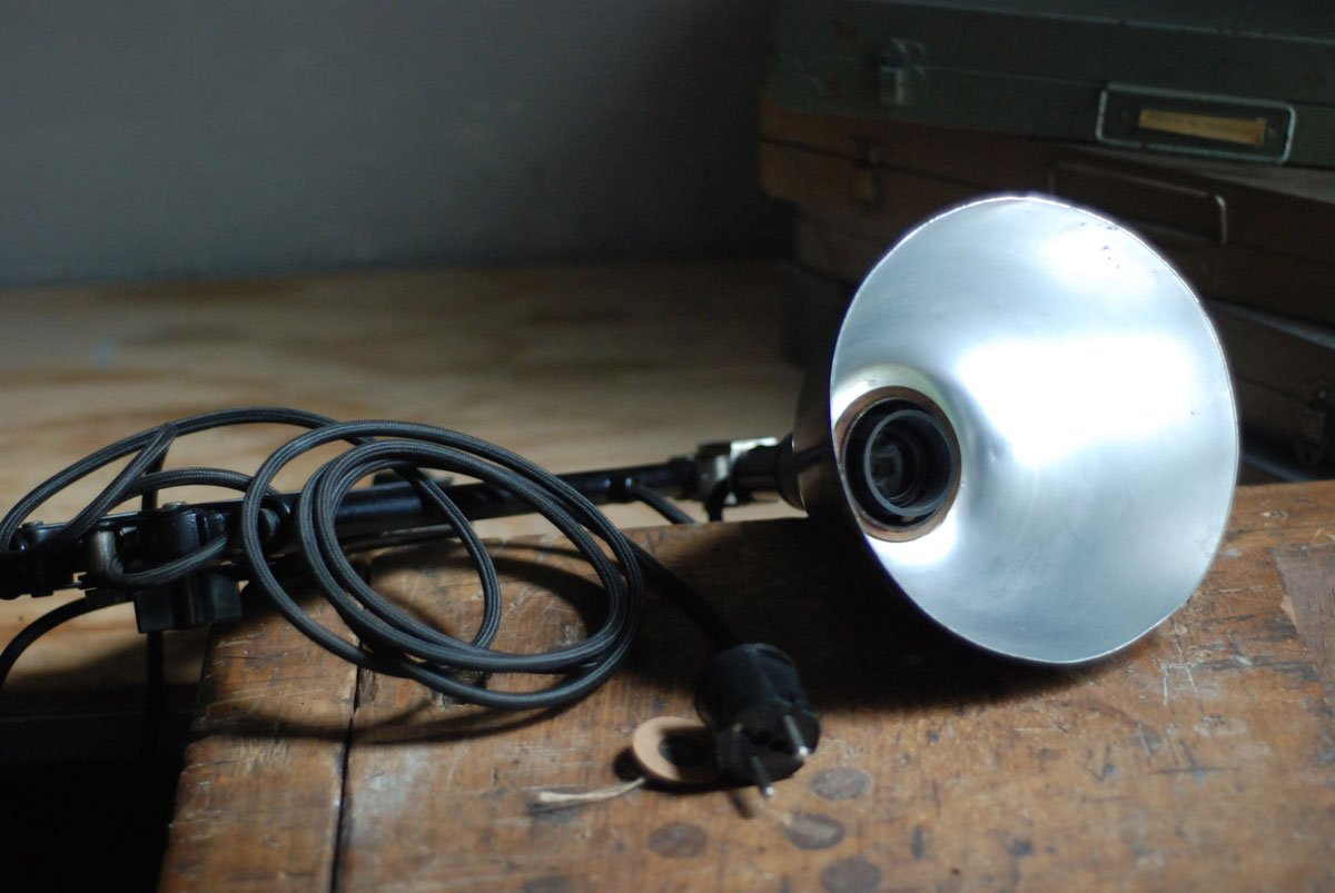 Alte Scherenlampe Midgard D.R.G.M., mod.109. mit schwarzer Lackierung und Reflektor aus Aluminium mit Patina.