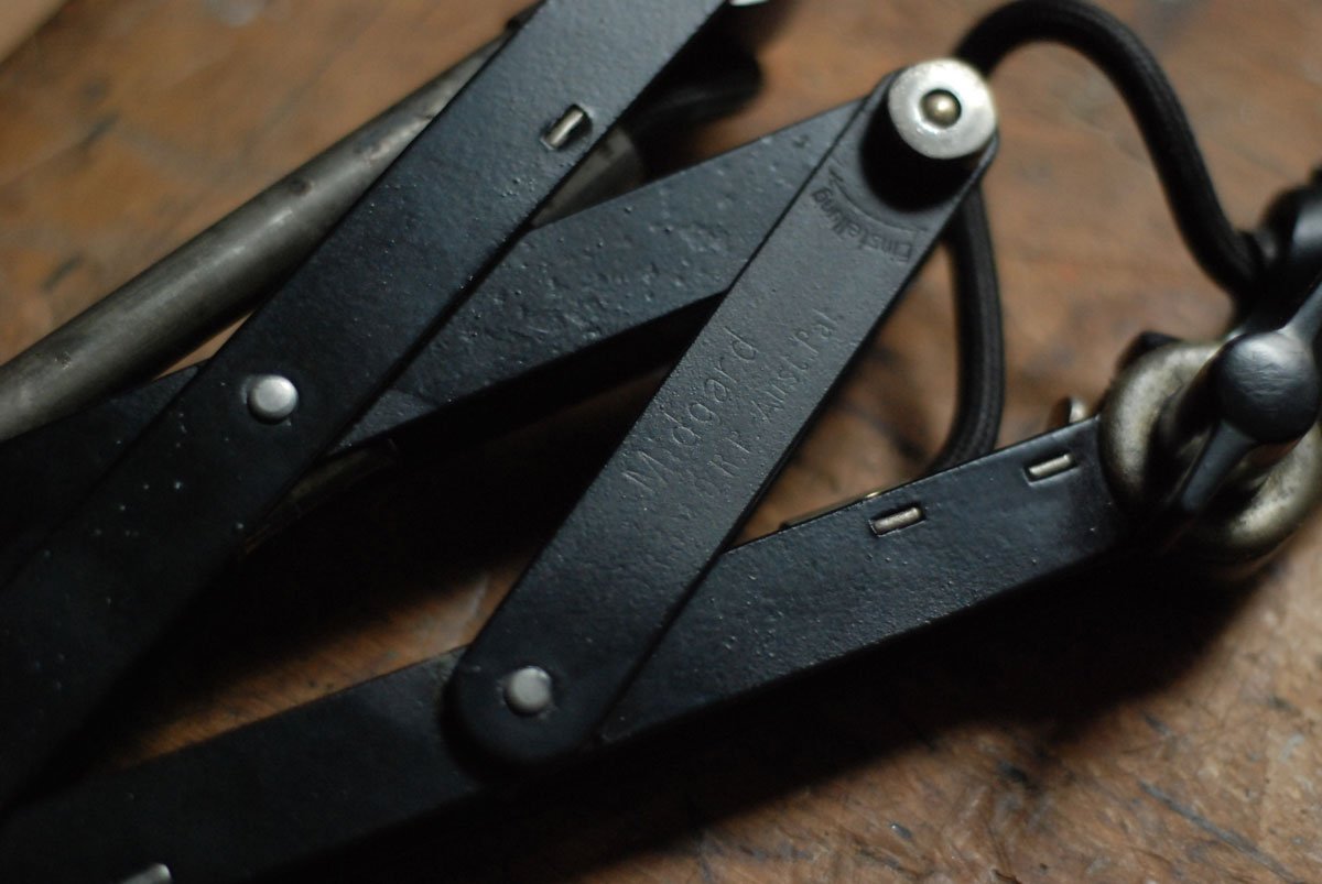 Geprägt ist die Leuchte am Kopf mit dem MIDGARD Logo und DRGM DRP Ausl. Pat. (Vorkrieg), auf der Schere mit Midgard DRM DRP Ausl Pat. und ‚Einstellung‘.