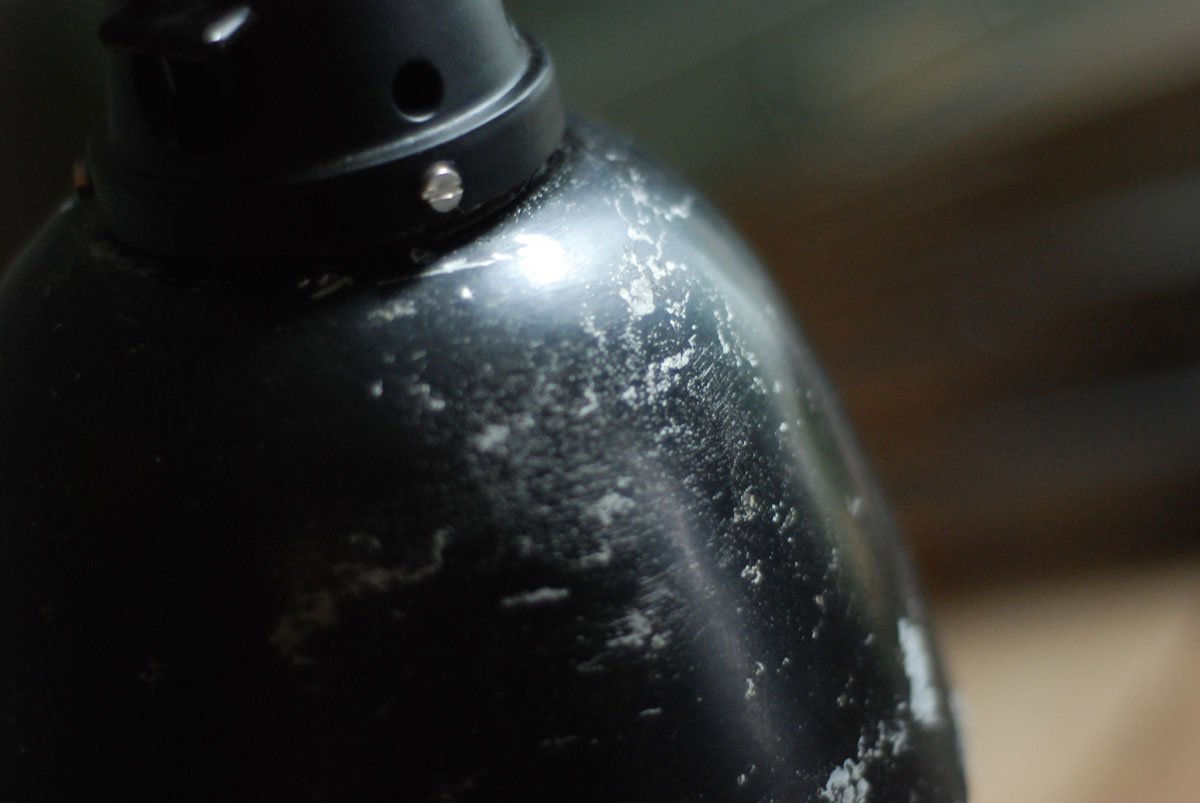 Nach der kompletten Zerlegung wurden die Elemente der Leuchte entlackt, sorgfältig gereinigt, neu lackiert und neu aufgebaut. Der Schirm trägt Zeitspuren und weist eine schöne Patina auf. Die Leuchte weist dem Alter entsprechend Gebrauchsspuren auf. Alle Einzelteile wurden entrostet, sorgfältig gereinigt, geölt.