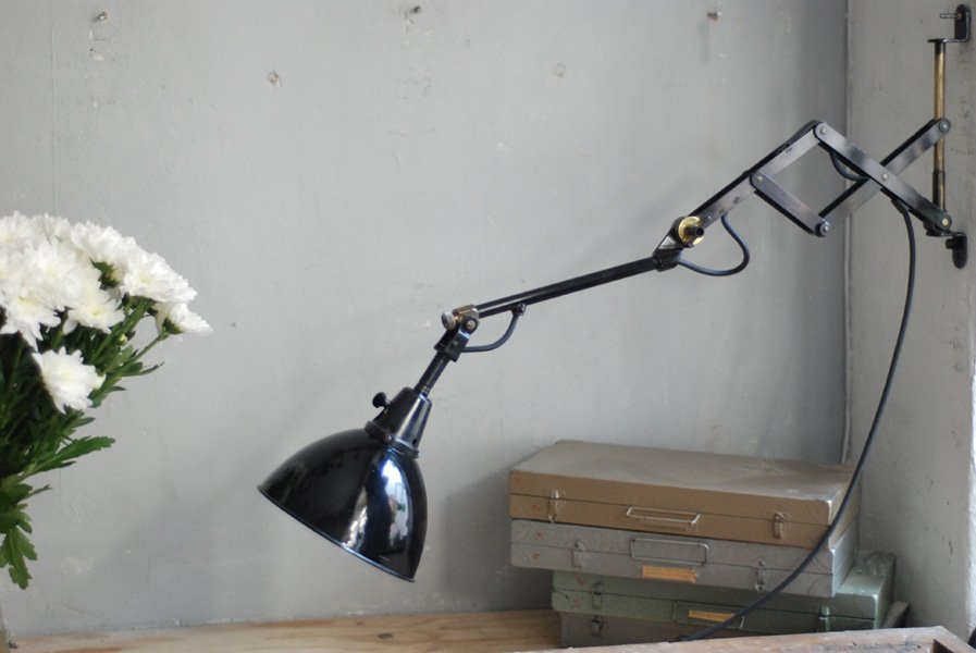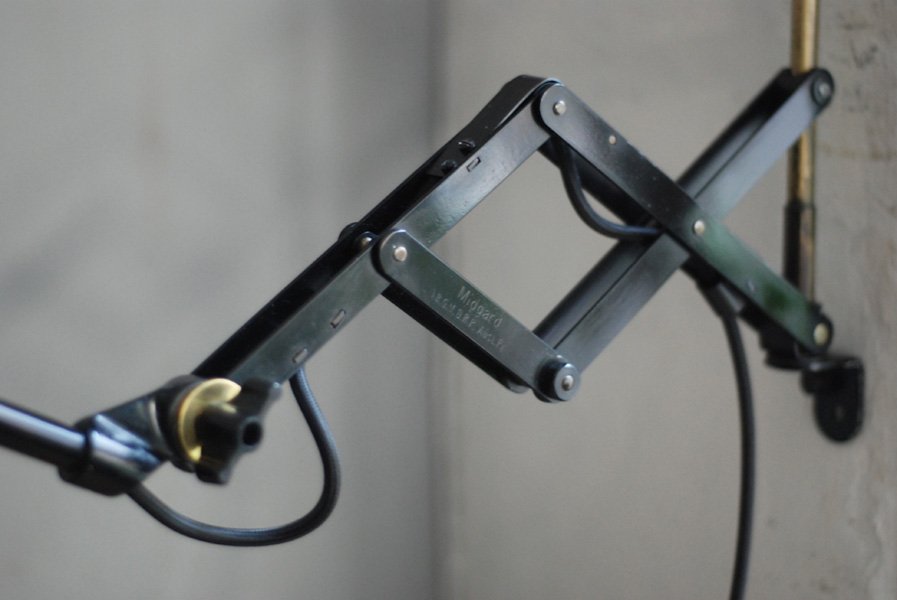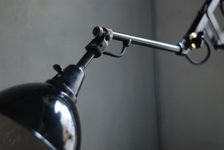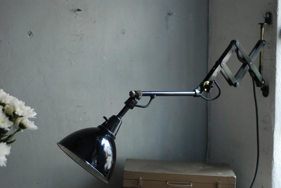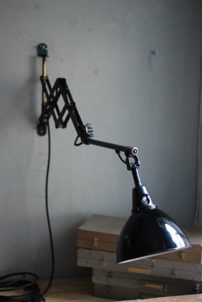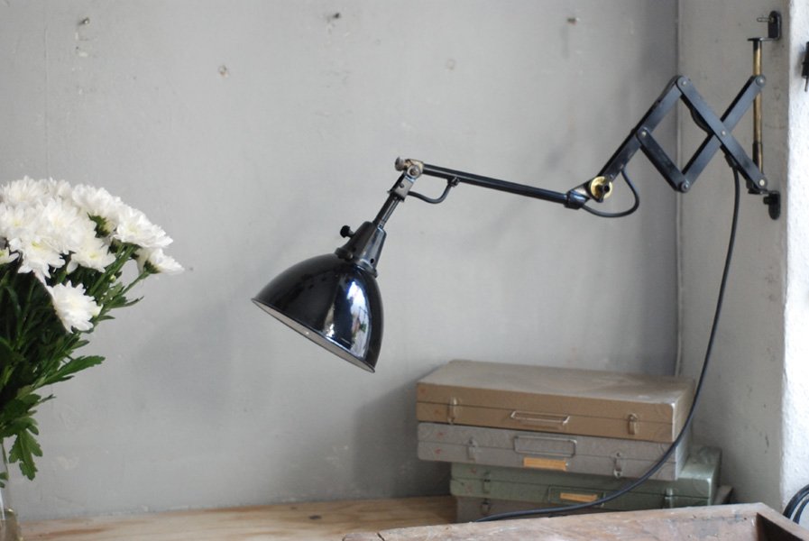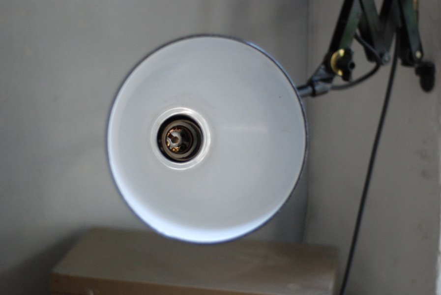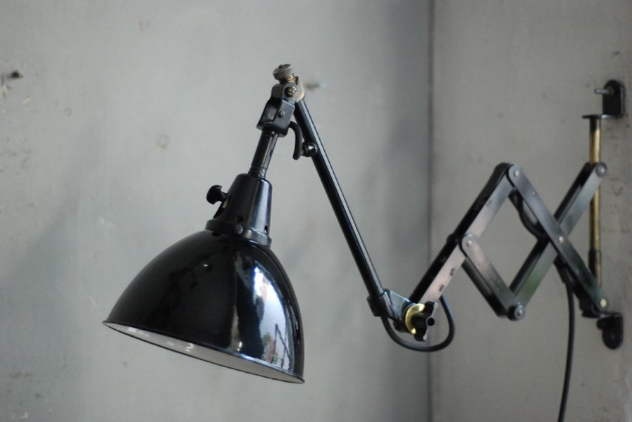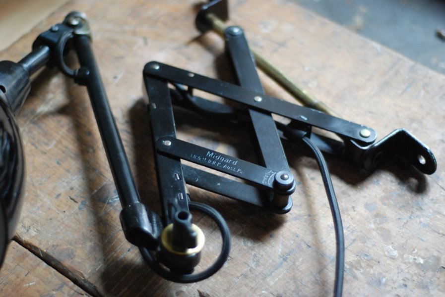 Alte Scherenlampe Midgard D.R.G.M., mod.109. mit Originallackierung und grossem emailliertem Reflektor.