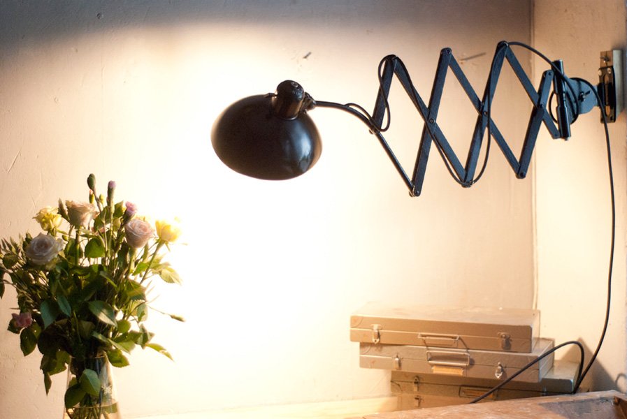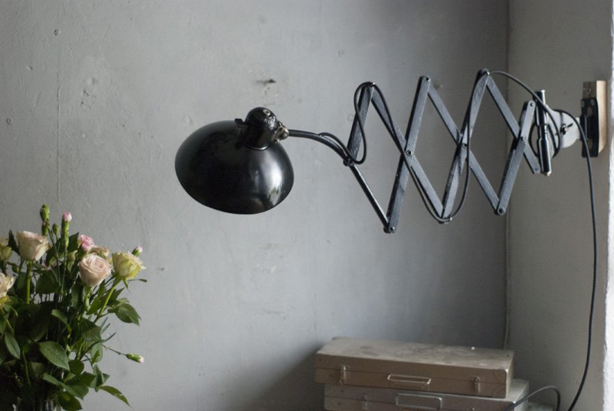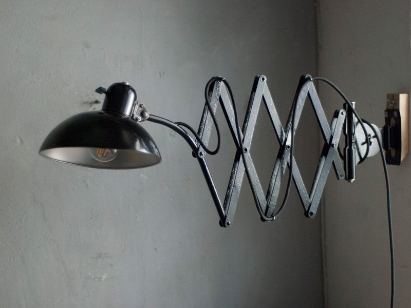 Grosse schwarz lackierte Scherenleuchte Kaiser Idell 6614 Super mit Patina.