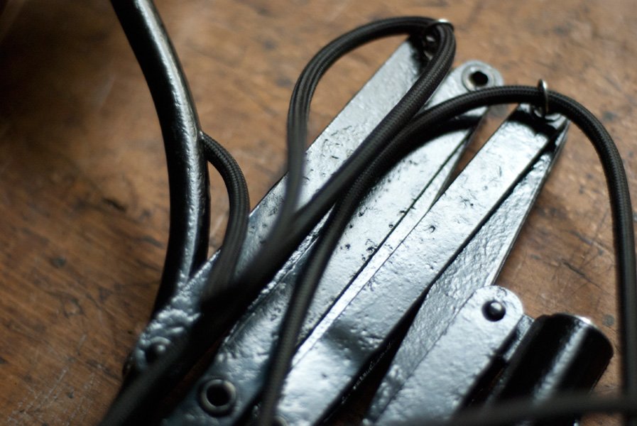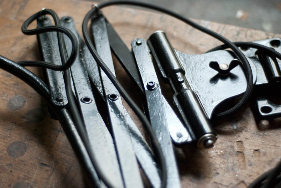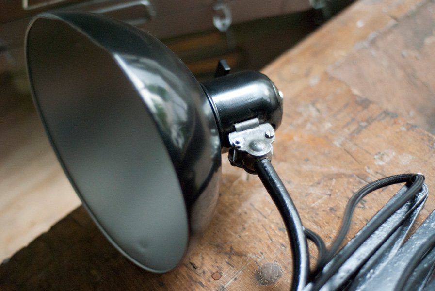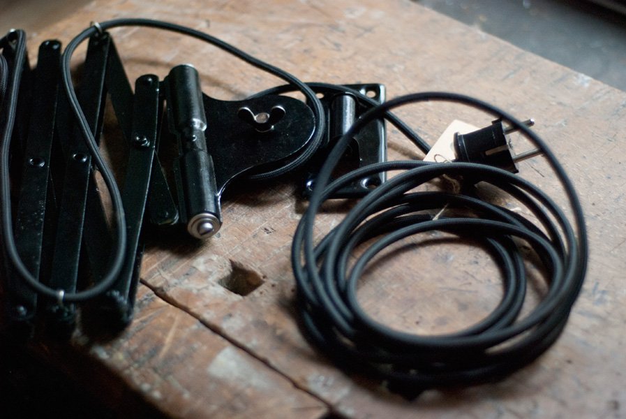 Die Elektrik wurde dreiadrig erneuert und generalüberholt. Es wurde ein schwarzes, stoffummanteltes Kabel verwendet.Die Leuchte wird mittels eines Drehschalters an der Fassung betätigt.