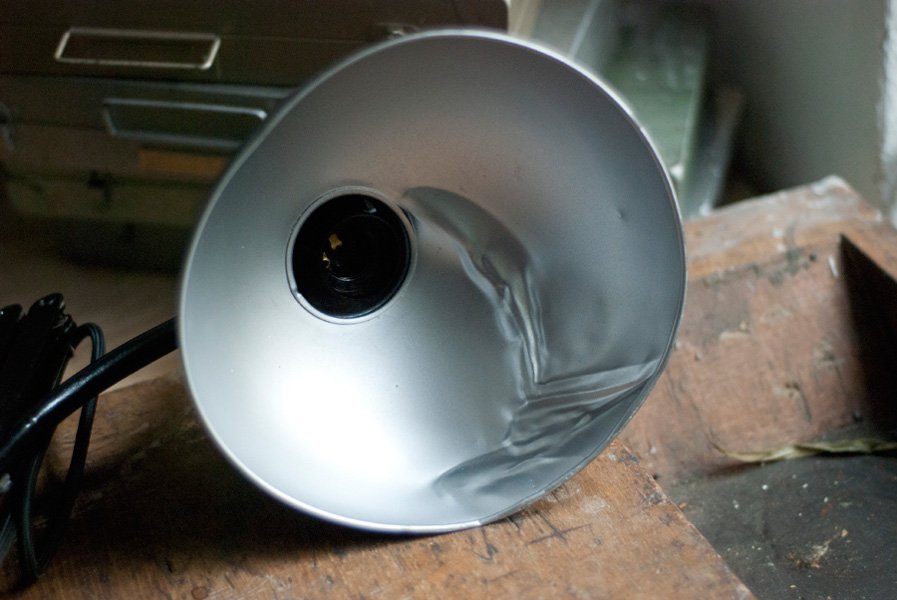 Der gebrauchte Zustand weist altersbedingte Spuren, eine schöne Patina an der Schere auf. Der Schirm hat innerlich Beulen und ist leicht verformt. Die Technik der Leuchte funktioniert jedoch hält sie in der absteigenden Richtung keine geschlossene Position.