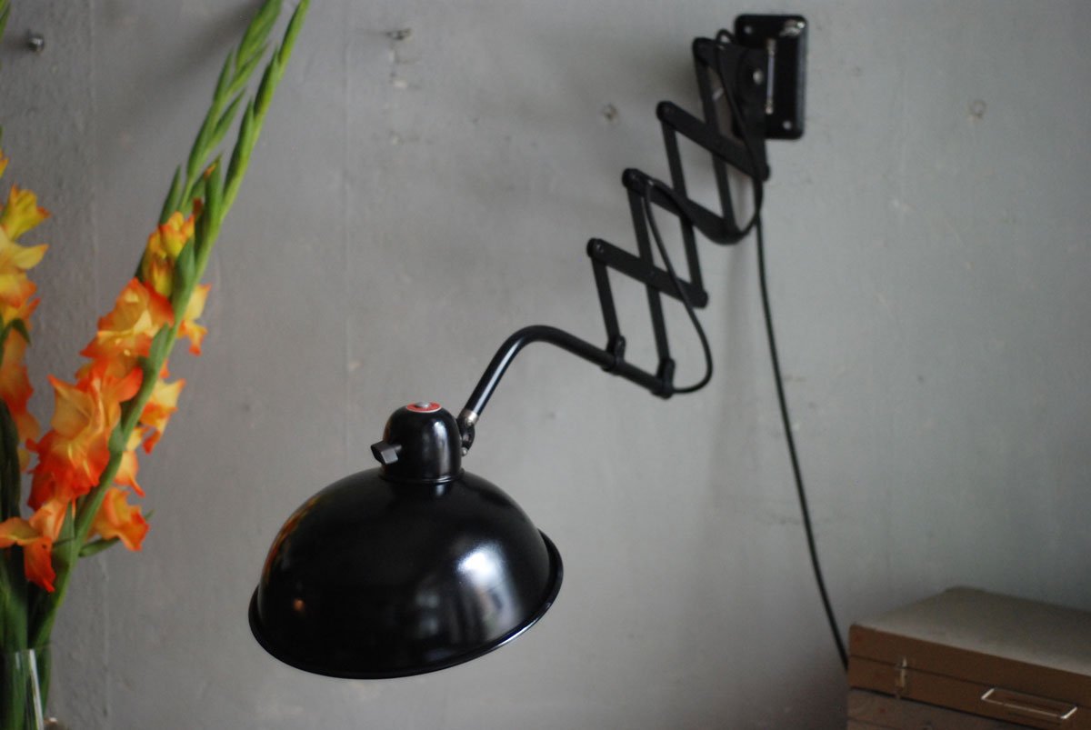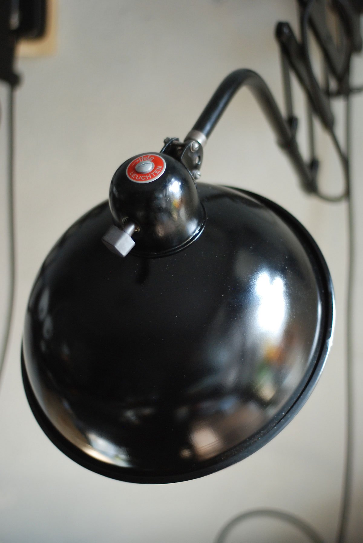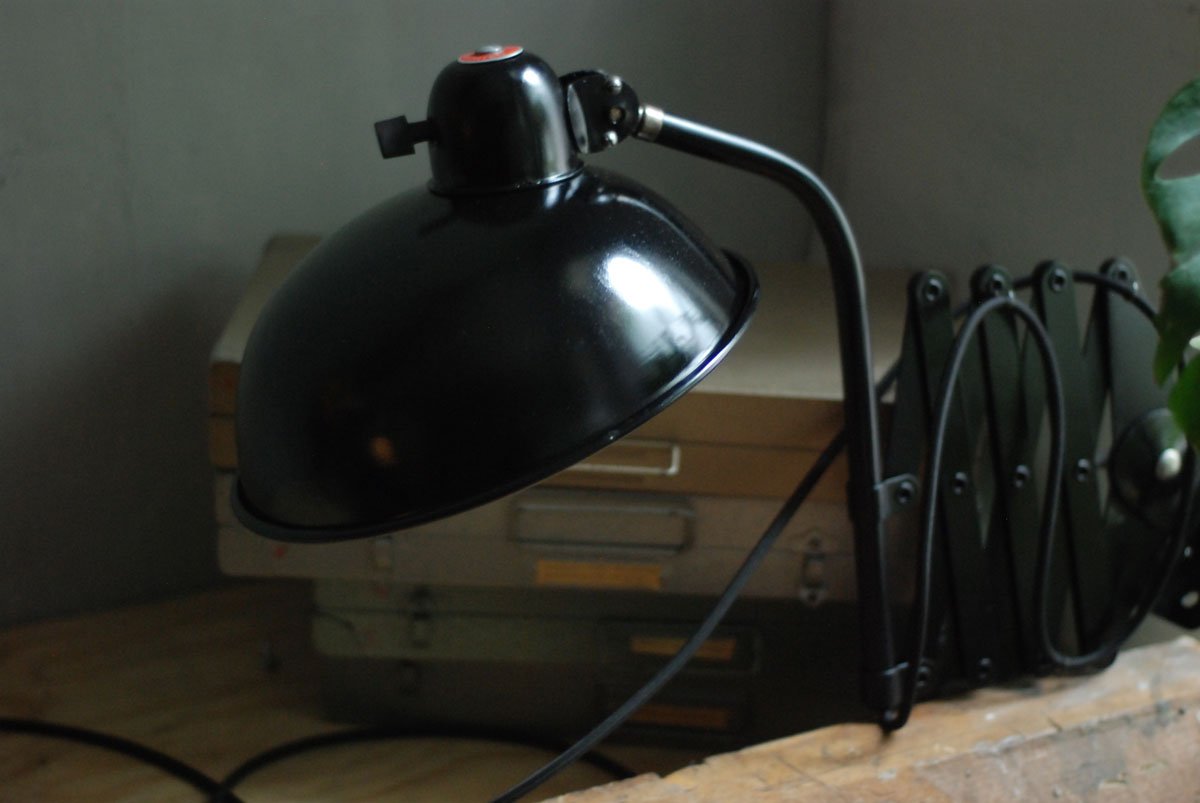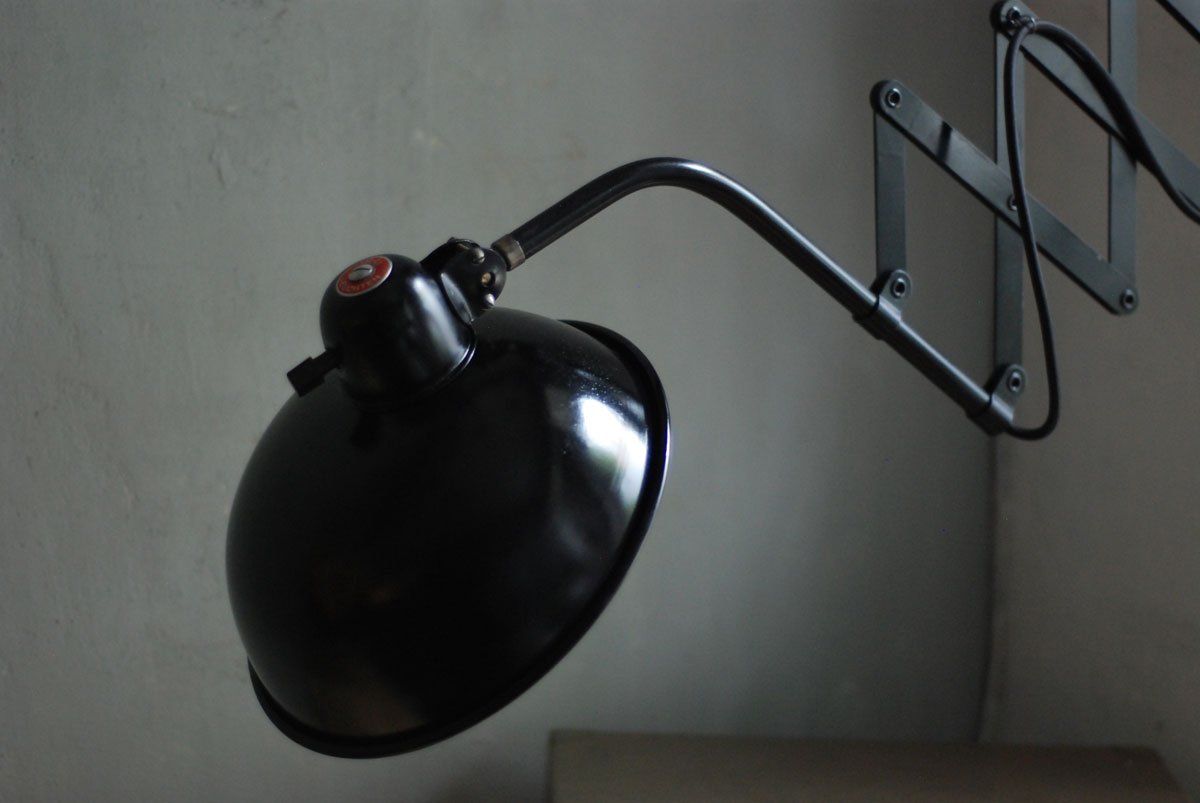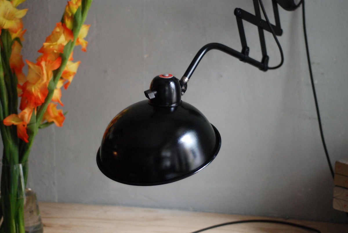 Schwarze elegante Scherenlampe Helo mit breitem Reflektor   Helo Leuchten ist eine Marke der Firma Kaiser und Co, für welche Christian Dell eine umfangreiche Leuchtenserie ab 1933 entwarf. 1930er Jahre, Bauhaus Nach der kompletten Zerlegung wurden die Elemente der Leuchte gereinigt, entlackt, neu lackiert und neu aufgebaut. Alle Einzelteile wurden entrostet, poliert, geölt. Der gebrauchte…