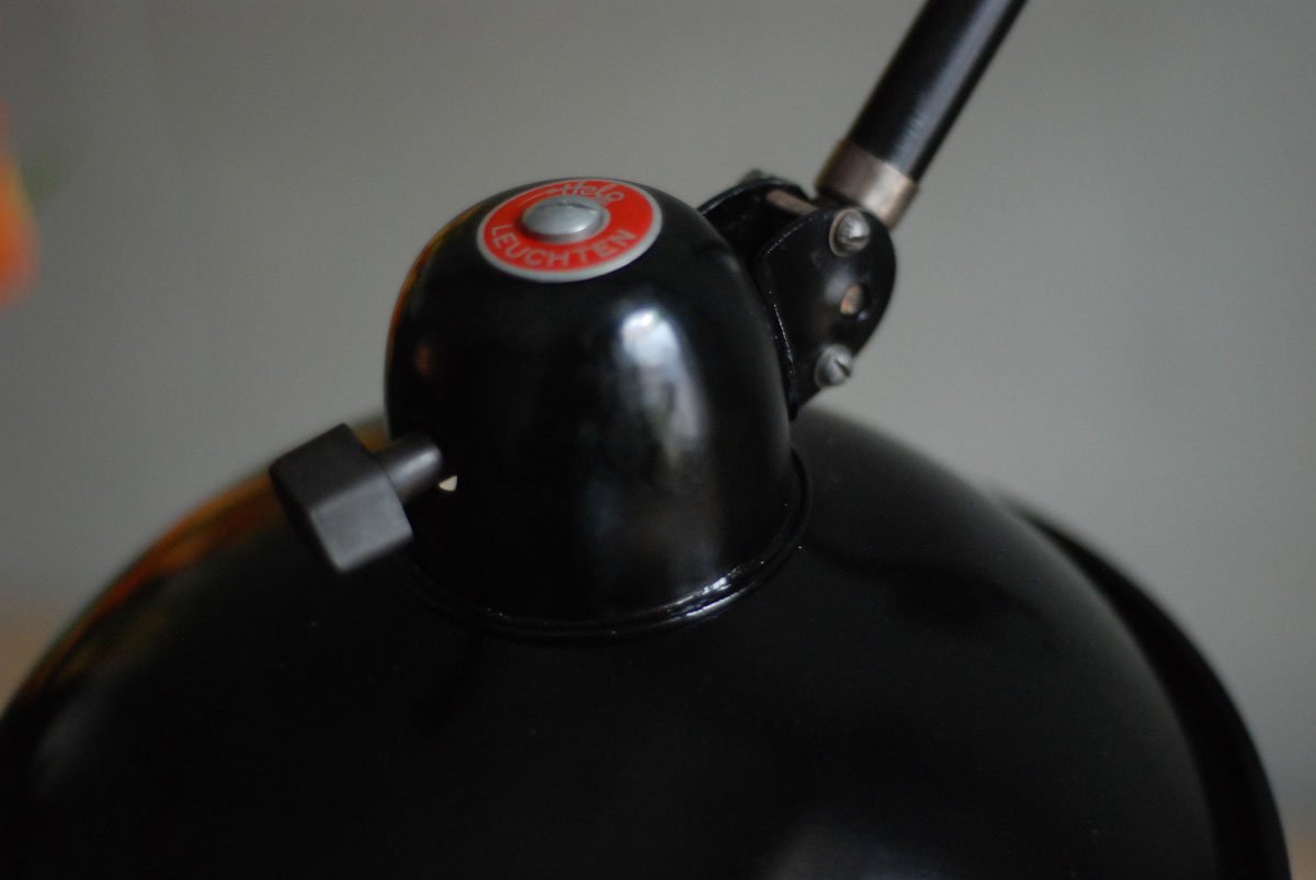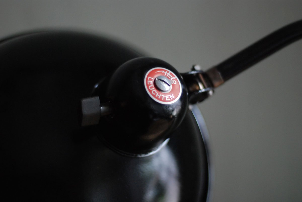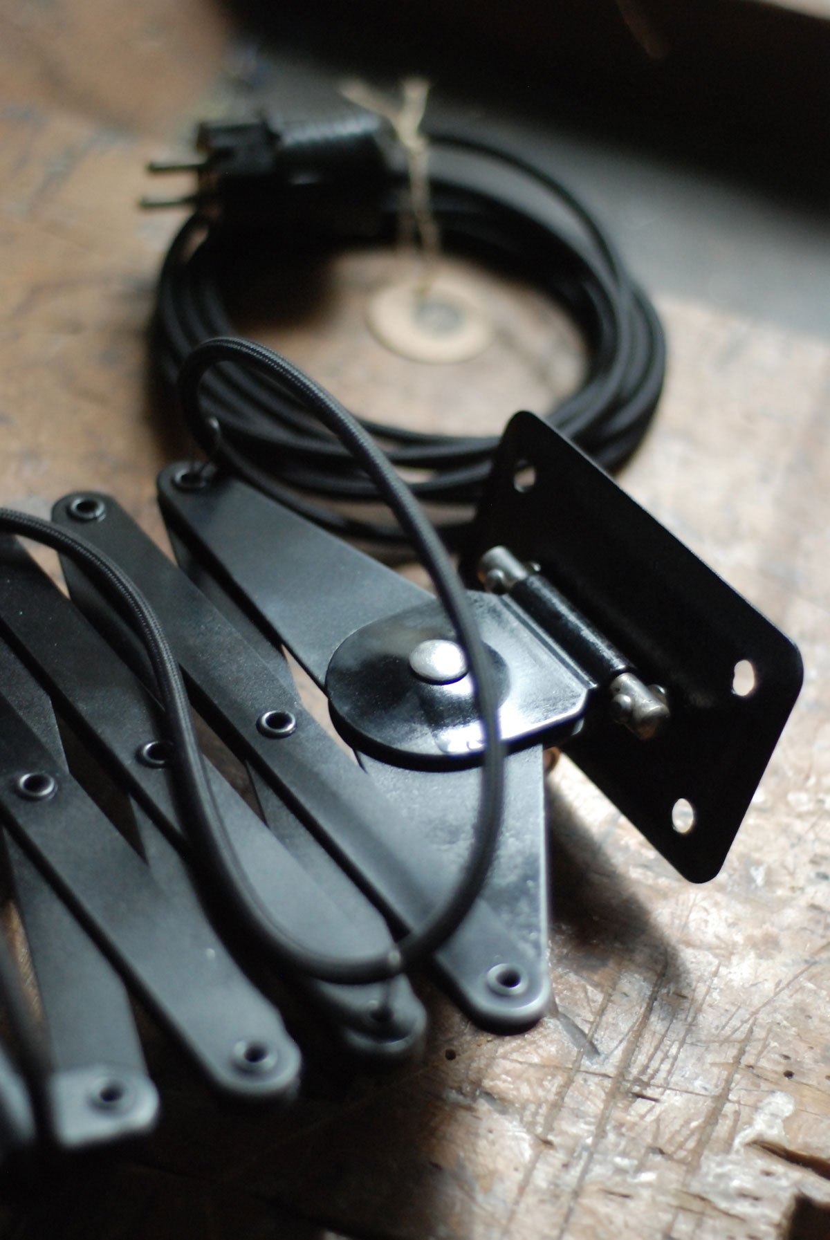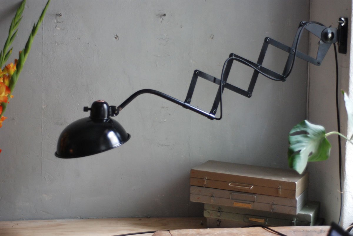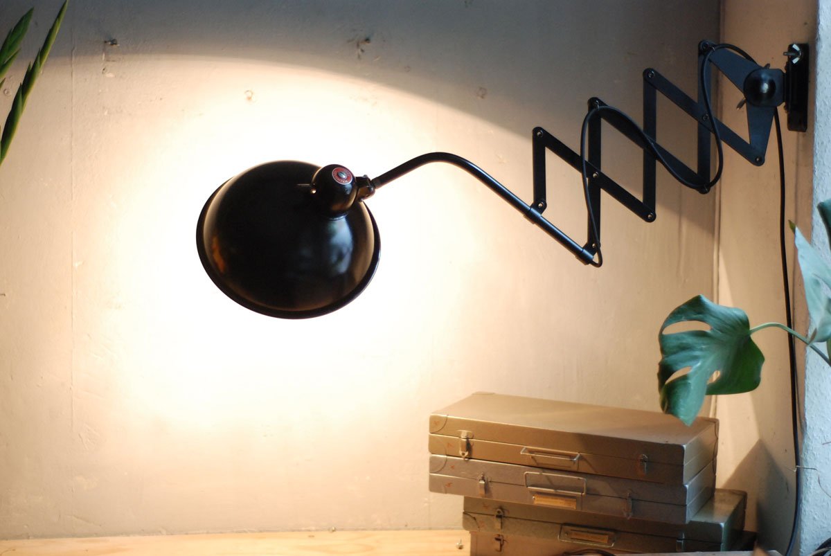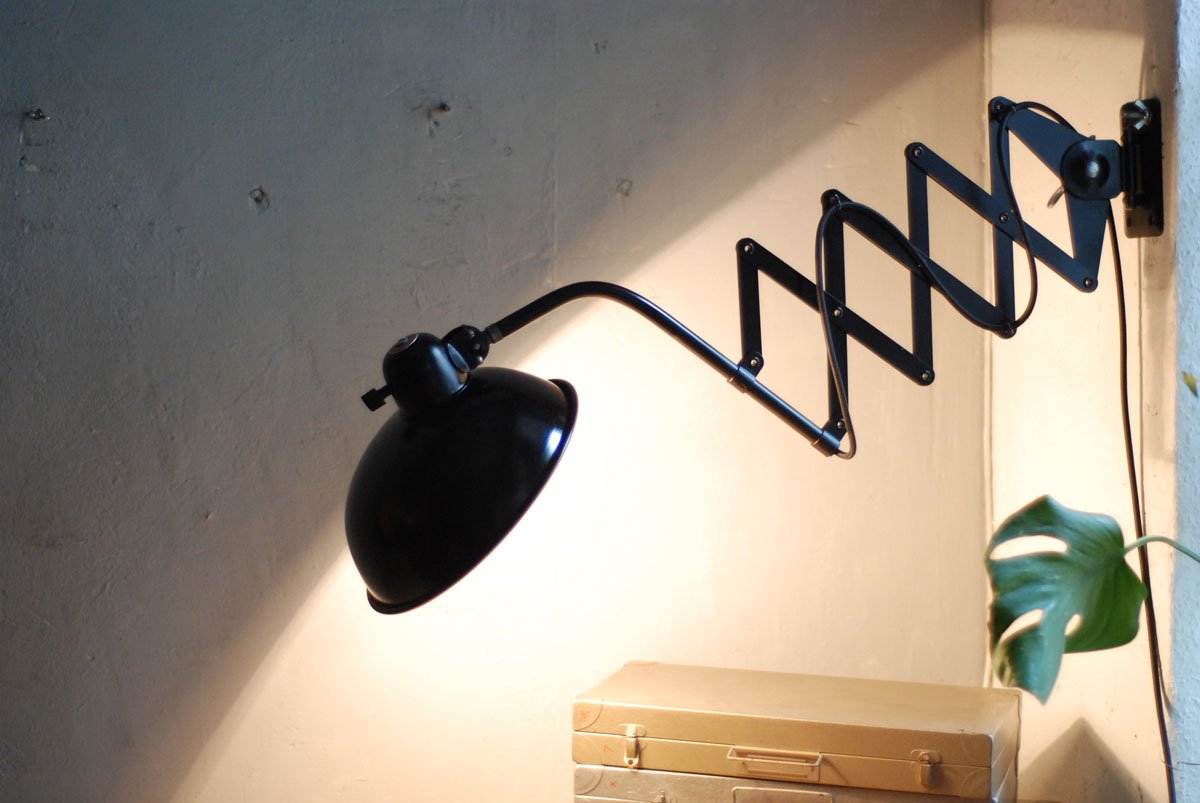 Schwarze elegante Scherenlampe Helo mit breitem Reflektor   Helo Leuchten ist eine Marke der Firma Kaiser und Co, für welche Christian Dell eine umfangreiche Leuchtenserie ab 1933 entwarf. 1930er Jahre, Bauhaus Nach der kompletten Zerlegung wurden die Elemente der Leuchte gereinigt, entlackt, neu lackiert und neu aufgebaut. Alle Einzelteile wurden entrostet, poliert, geölt. Der gebrauchte…