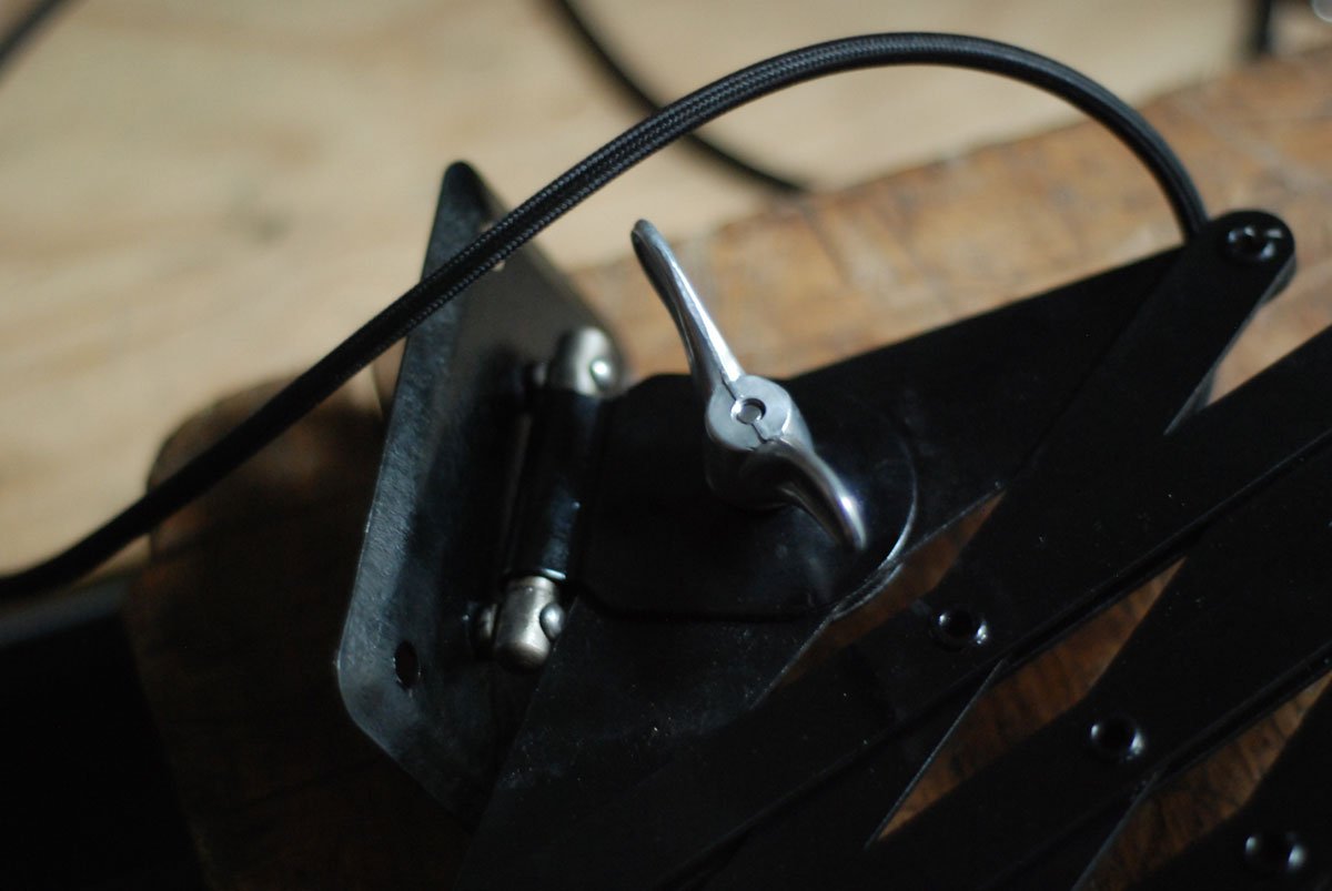 Nach der kompletten Zerlegung wurden die Elemente der Leuchte gereinigt, entlackt, neu lackiert und neu aufgebaut. Alle Einzelteile wurden entrostet, poliert, geölt.