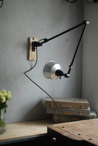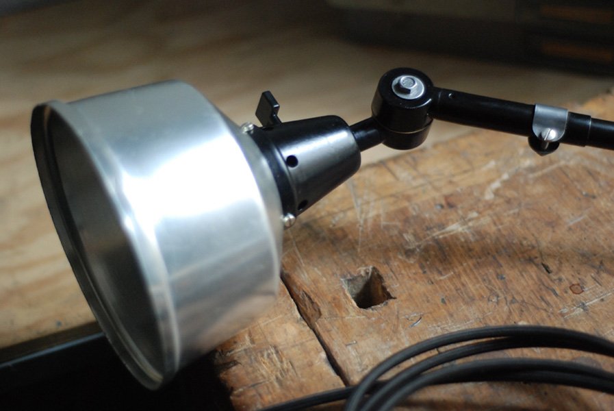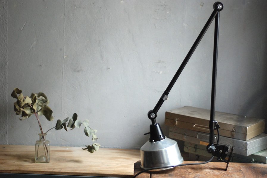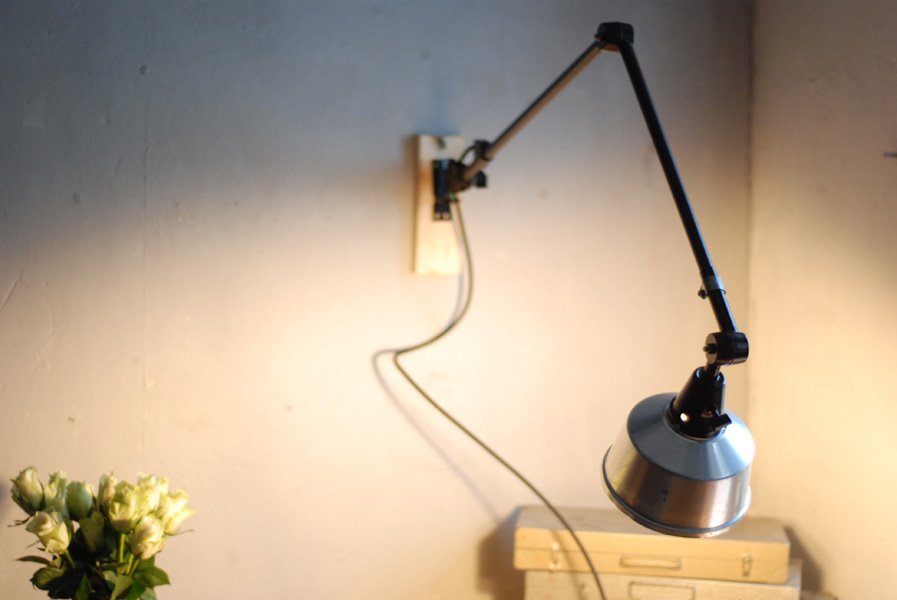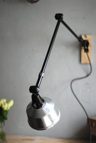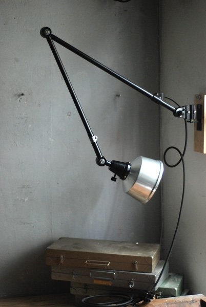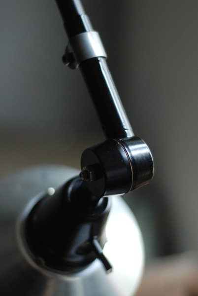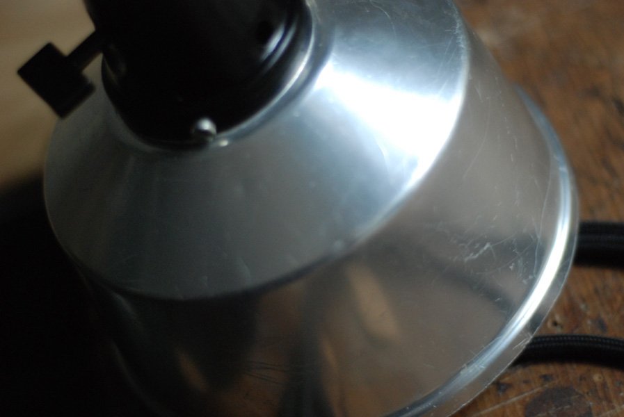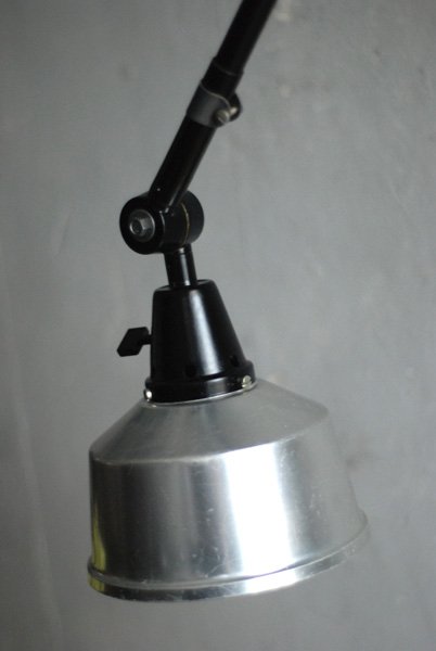 Die Leuchte befindet sich in einem gebrauchten Zustand. Die Arme weisen Patina auf. Der Schirm aus Aluminium weist Alter- und Nutzungsspuren, feine Kratzer und leichte Beule auf.