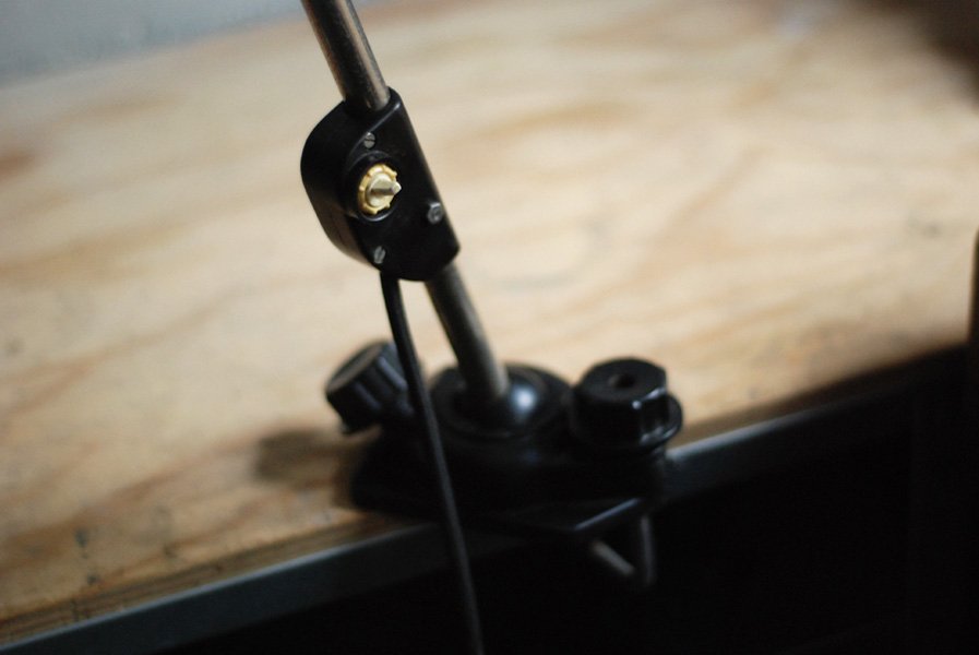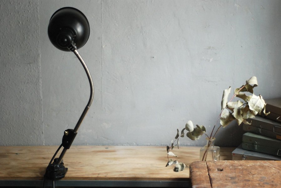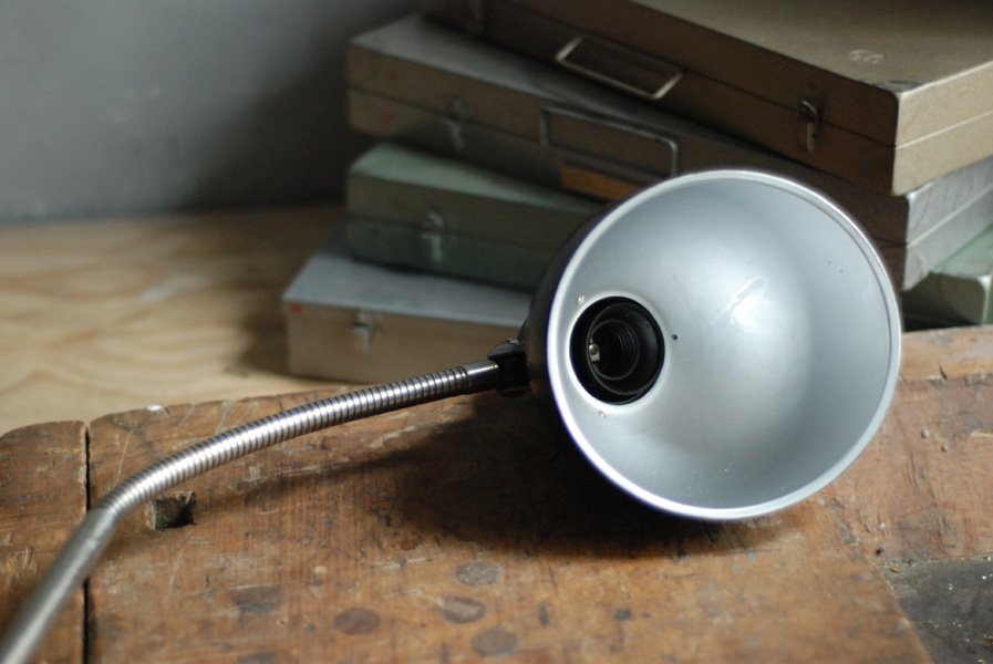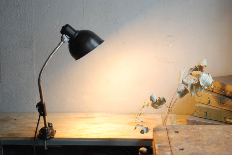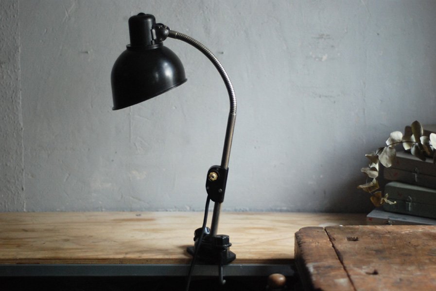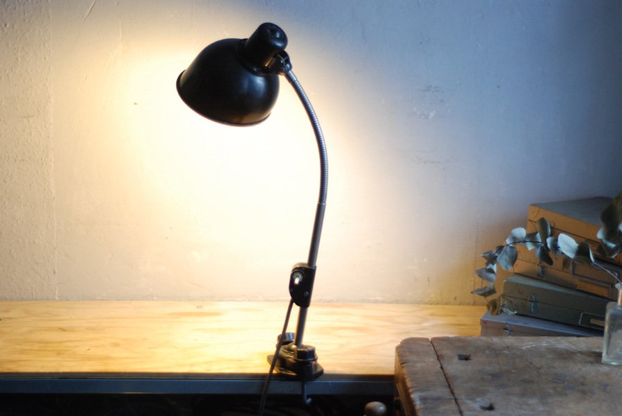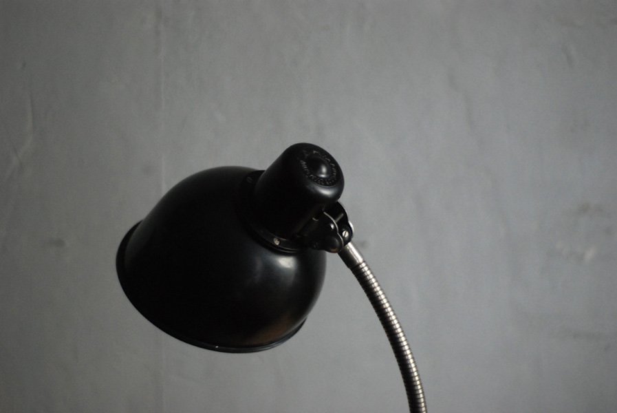 Die Lampe hat dem Alter entsprechend Lager- und Gebrauchsspuren, sie befindet sich in einem guten Zustand. Der Schwanenhals lässt in der gestreckten Position leicht nach. Der Klemmfuss aus Bakeit weist einen Riss und einen Splitter auf.