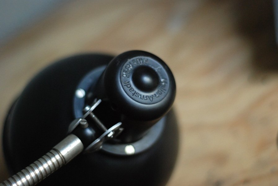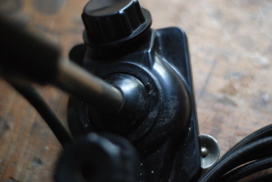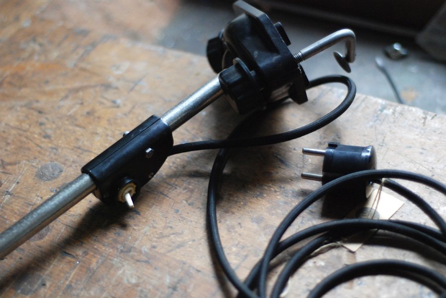 Die Elektrik wurde dreiadrig erneuert und generalüberholt. Es wurde ein schwarzes, stoffummanteltes Kabel verwendet. Die Leuchte wird mittels des original Kippschalters betätigt.