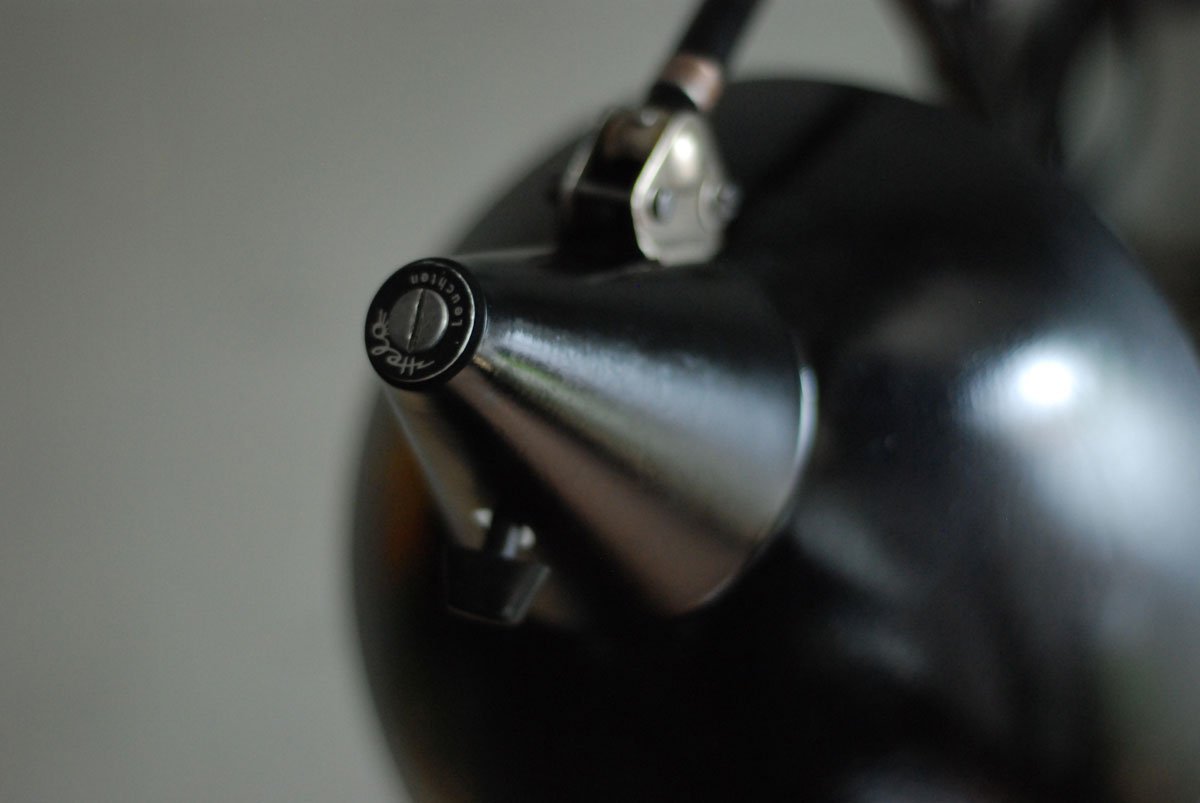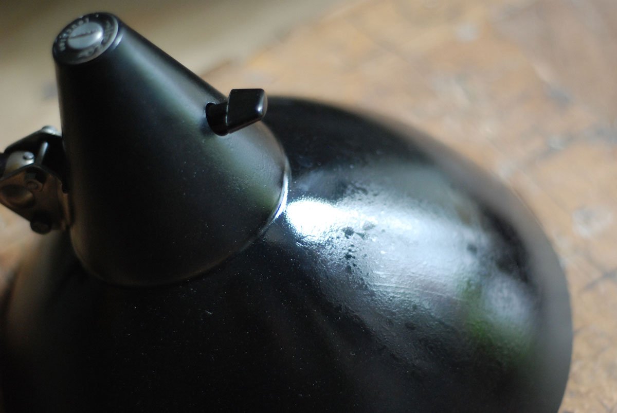 Nach der kompletten Zerlegung wurden die Elemente der Leuchte gereinigt, entlackt, neu lackiert und neu aufgebaut. Alle Einzelteile wurden entrostet, poliert, geölt.