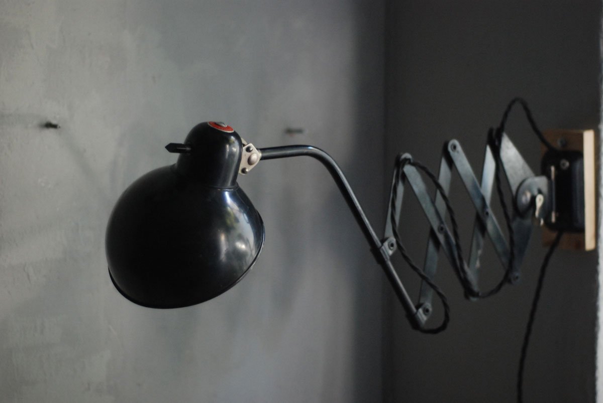 Schwarze Scherenlampe Helo mit schönem seltenem rundem Reflektor.