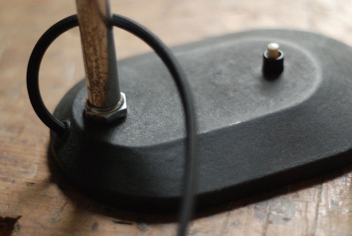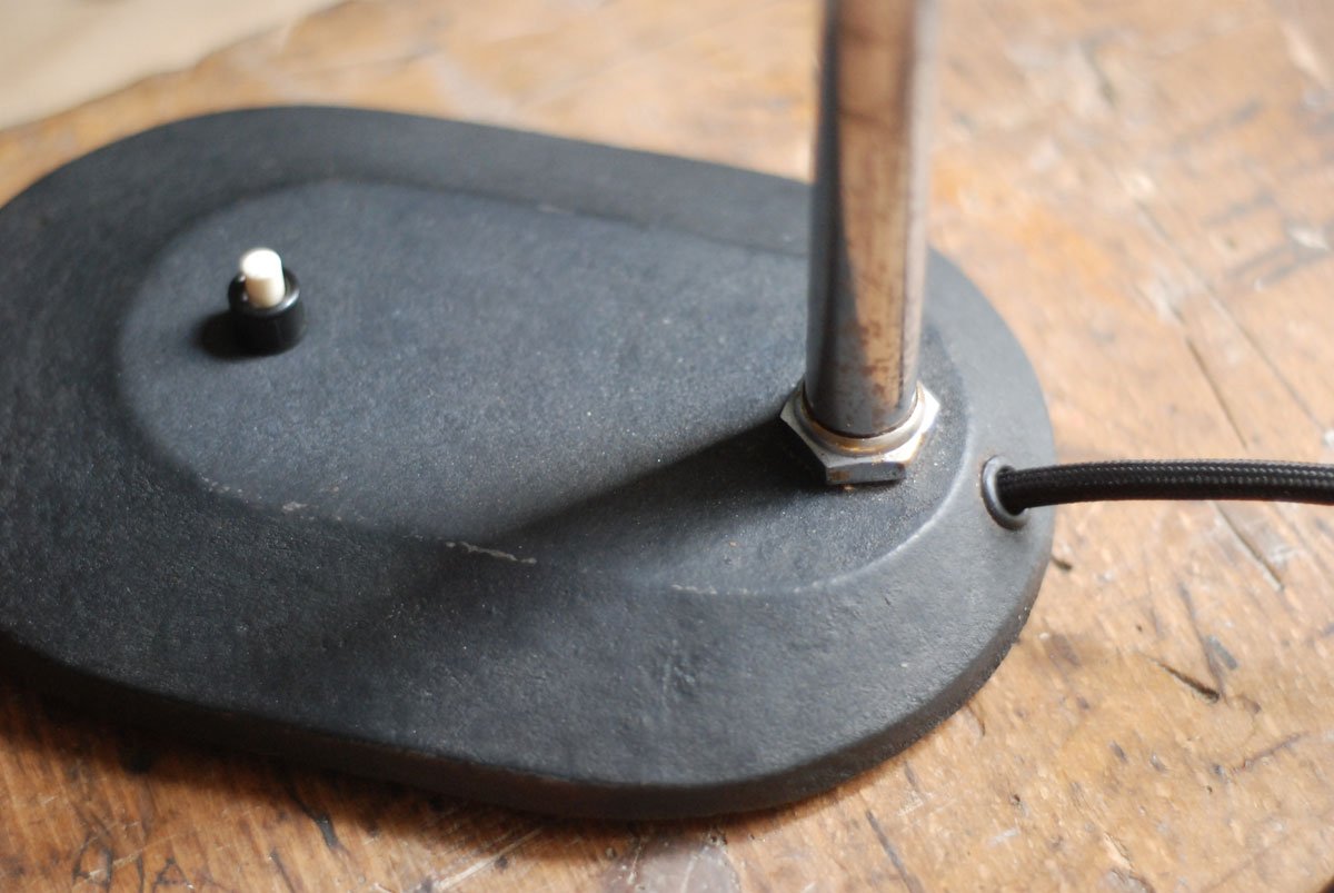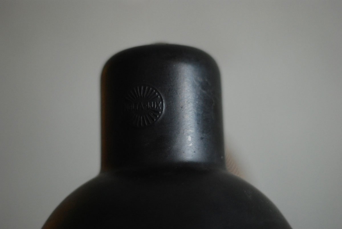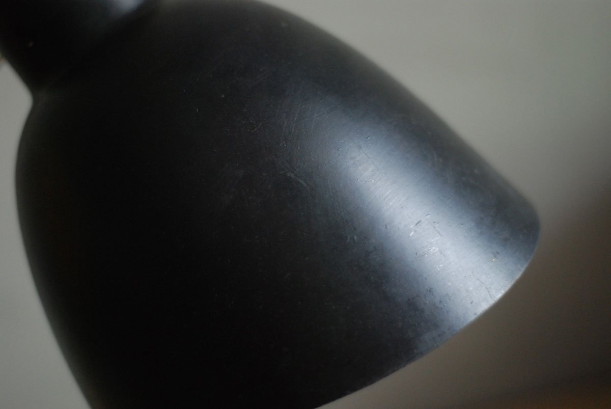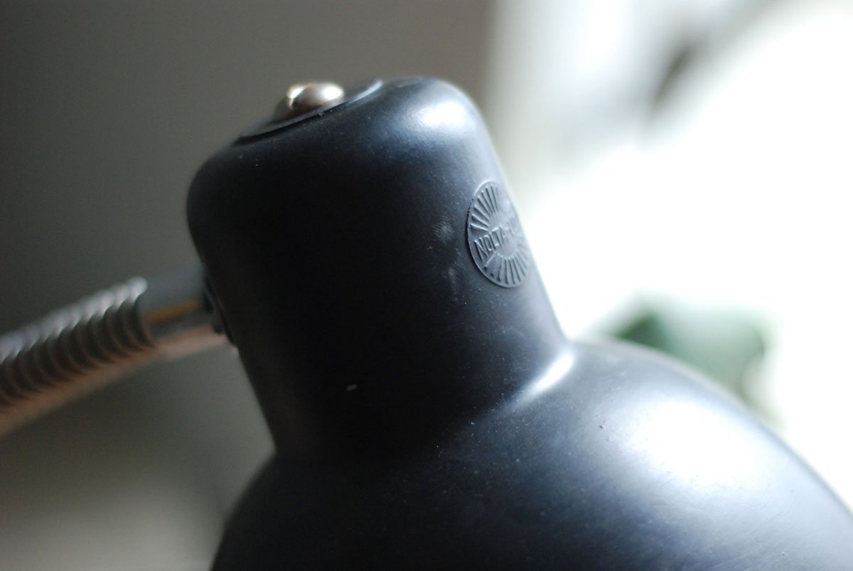 Die Leuchte ist mit „Nolta Lux“ geprägt. Sie wurde in den 30er hergestellt. Der Schirm aus Bakelit hat zwei kleine zeitliche Risse die kaum ausfallen.
