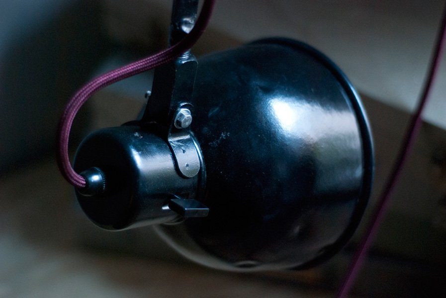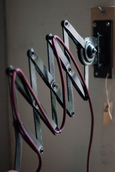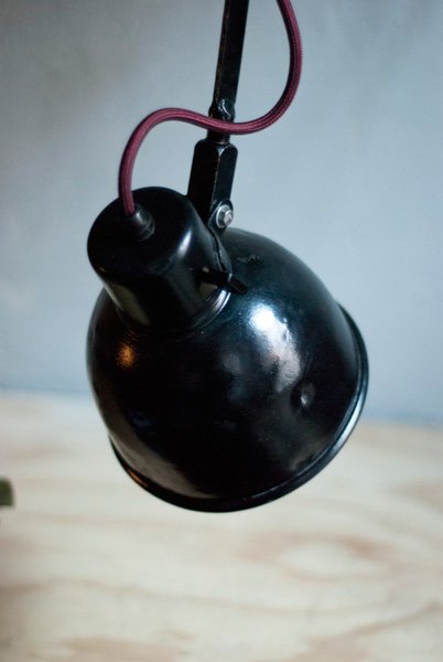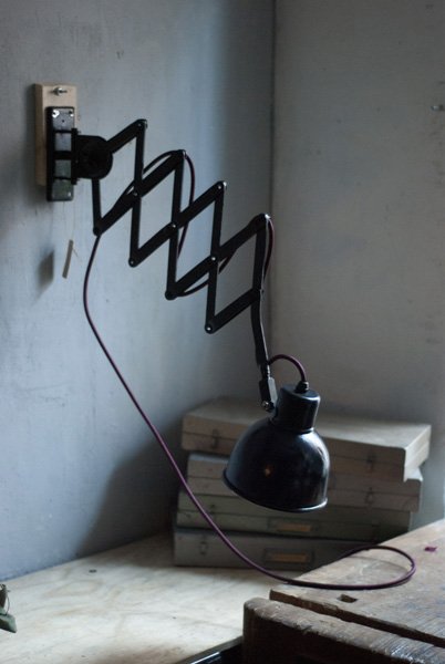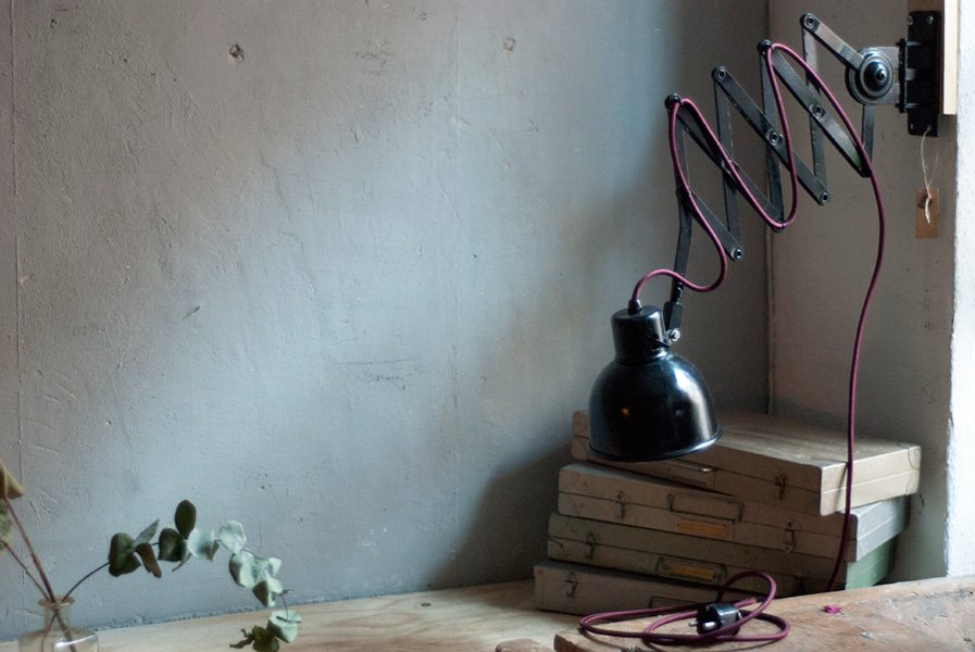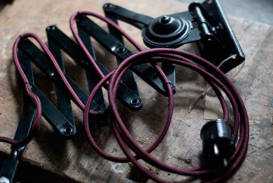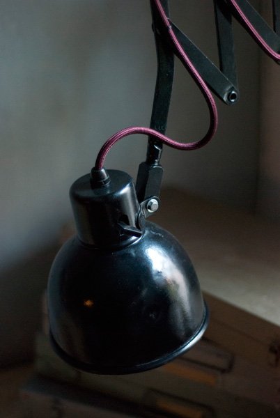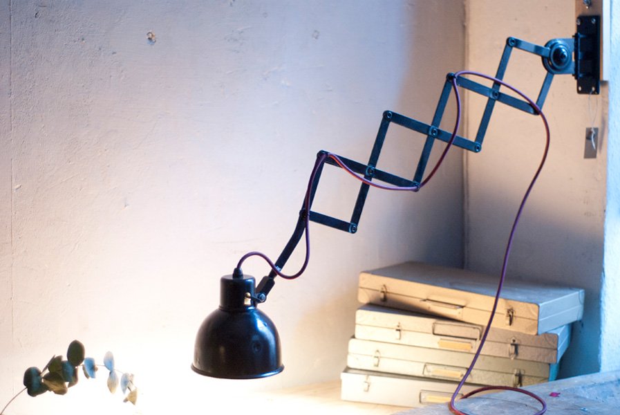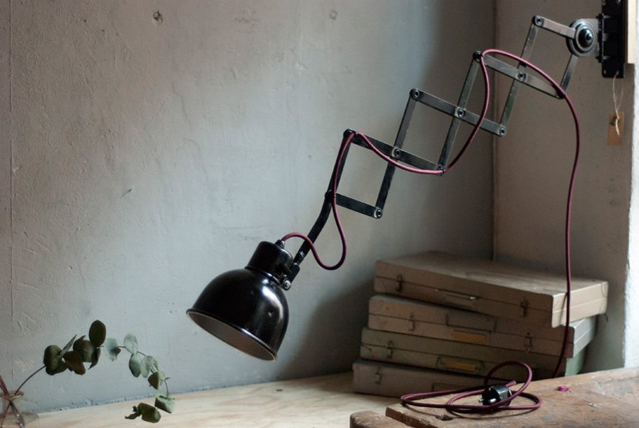 Schwarze Scherenleuchte PeHaWe  mit weinrotem Stoffkabel Nach der kompletten Zerlegung wurden die Elemente der Leuchte gereinigt, gepflegt neu lackiert und neu aufgebaut. Die Lampe hat dem Alter entsprechend Lager- und Gebrauchsspuren. Der Reflekor hat leiche Beulen. Die Elektrik wurde dreiadrig erneuert und generalüberholt. Es wurde ein weinrotes, stoffummanteltes Kabel verwendet. Die Leuchte wird mittels eines Drehschalters am…