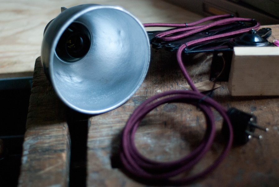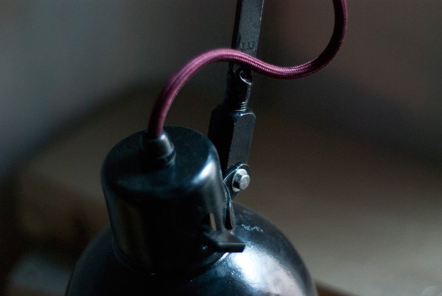 Die Elektrik wurde dreiadrig erneuert und generalüberholt. Es wurde ein weinrotes, stoffummanteltes Kabel verwendet. Die Leuchte wird mittels eines Drehschalters am Schirm im Uhrzeigersinn betätigt.