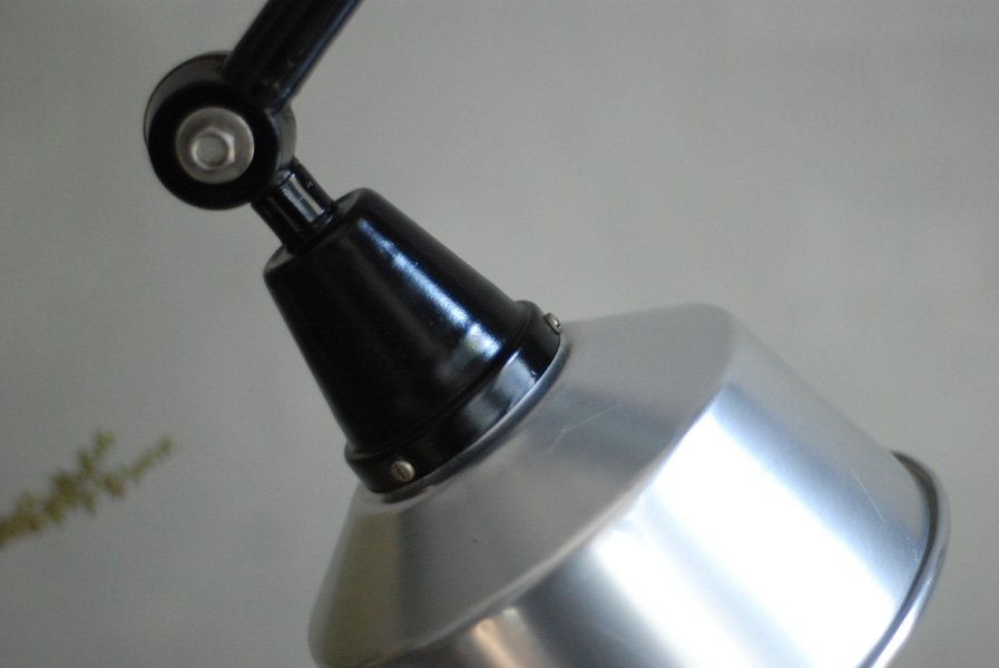 Die Leuchte befindet sich in einem gebrauchten Zustand. Der Schirm aus Aluminium weist sehr leichte Alter- und Nutzungsspuren auf, hat ein sehr leichte Beule.