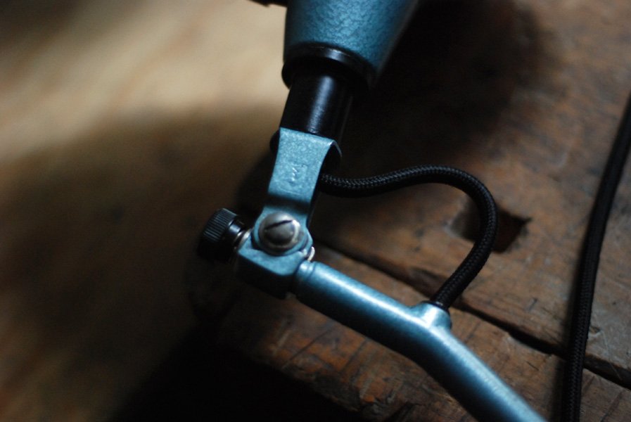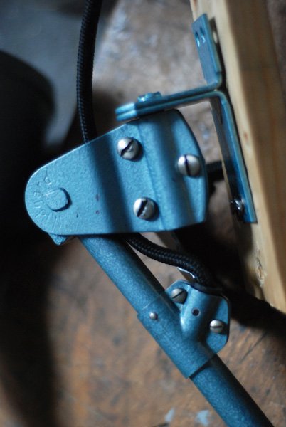Mit der (nicht originalen hammerschlagblau lackierten) Wandhalterung kann die Leuchte an die Wand mit Schrauben geschraubt werden.