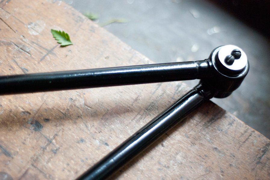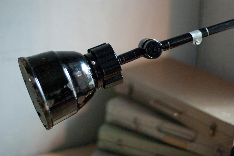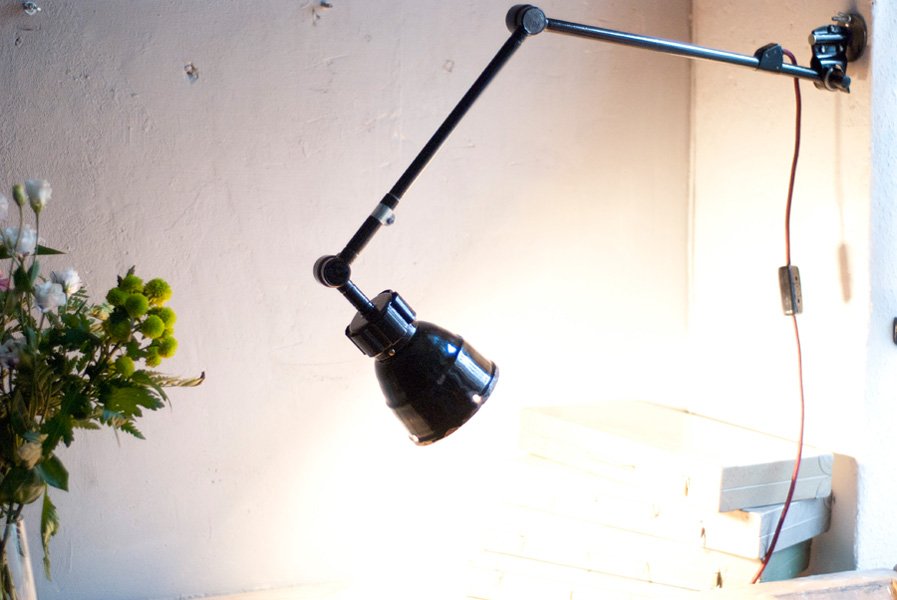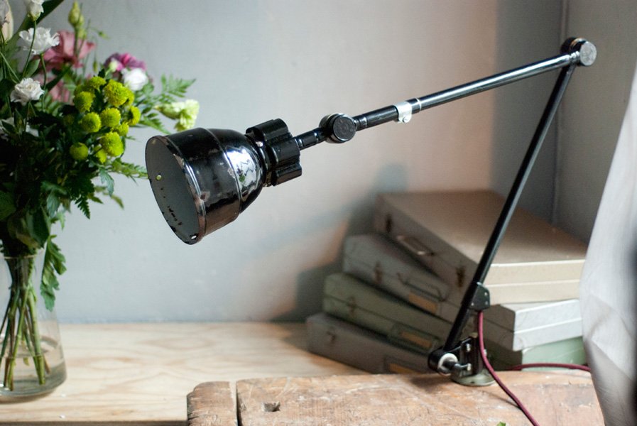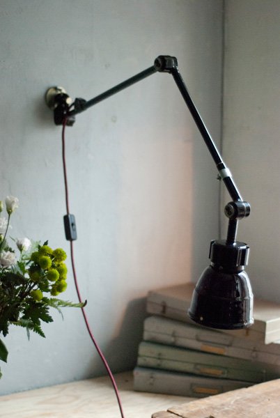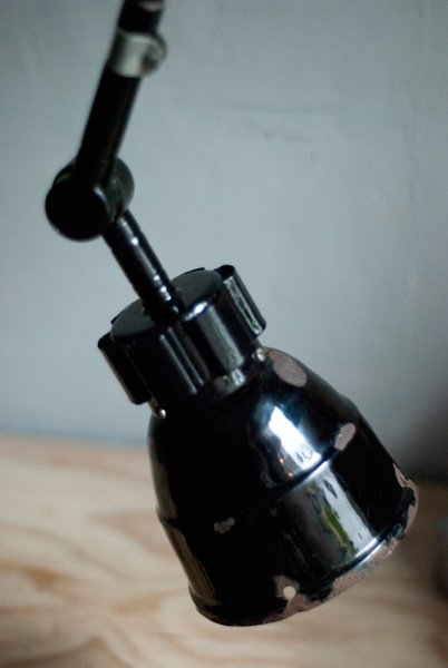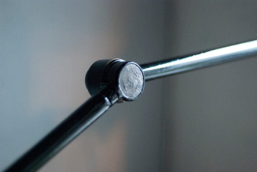Nach der kompletten Zerlegung und sorgsamen Reinigung wurden die Elemente der Leuchte entlackt, neu lackiert und neu aufgebaut. Ein abgebrochener Arm wurde ersetzt. Die Leuchte ist mit ‚Midgard‘ am Gelenk geprägt.