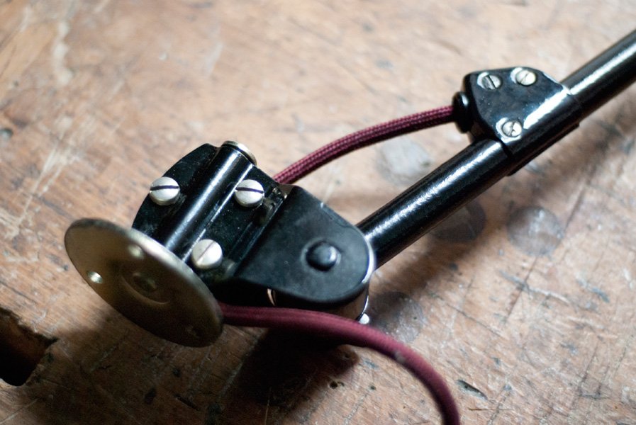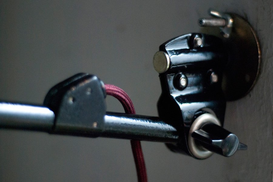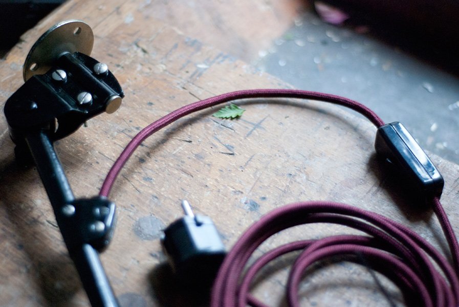 Die Elektrik wurde dreiadrig erneuert und generalüberholt. Es wurde ein bordeauxfarbenes, stoffummanteltes Kabel verwendet. Die Leuchte wird mittels eines Zwischenschalters an der Leitung betätigt.