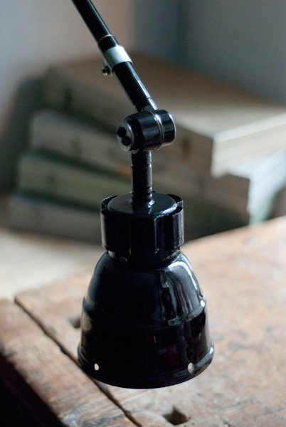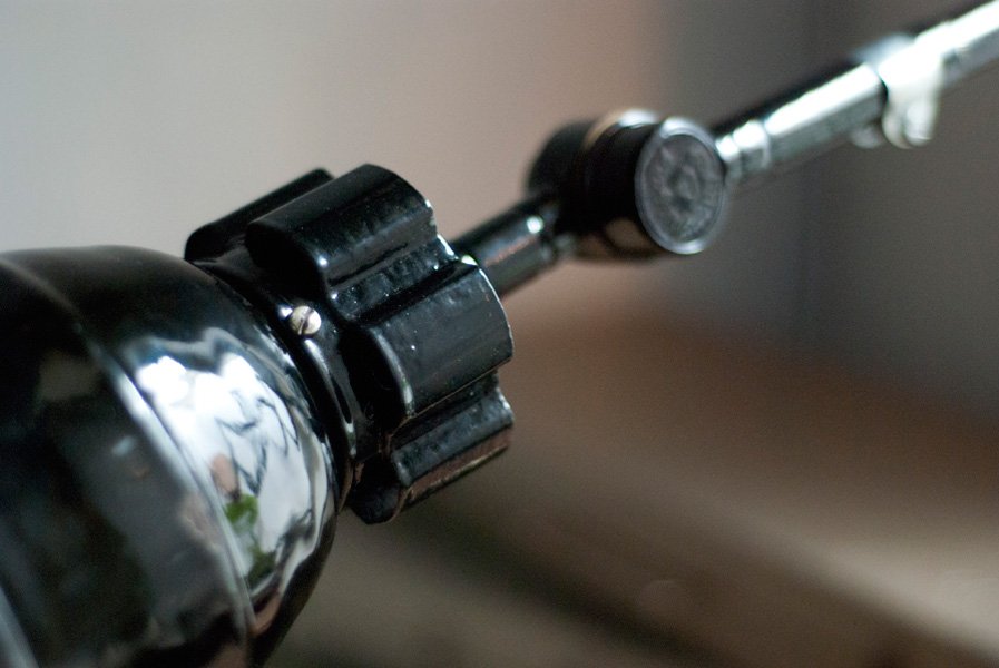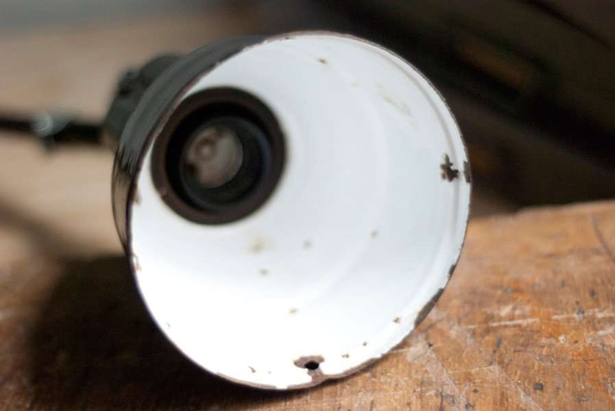Der schmale emaillierte Schirm weist deutliche Alter- und Nutzungsspuren auf.