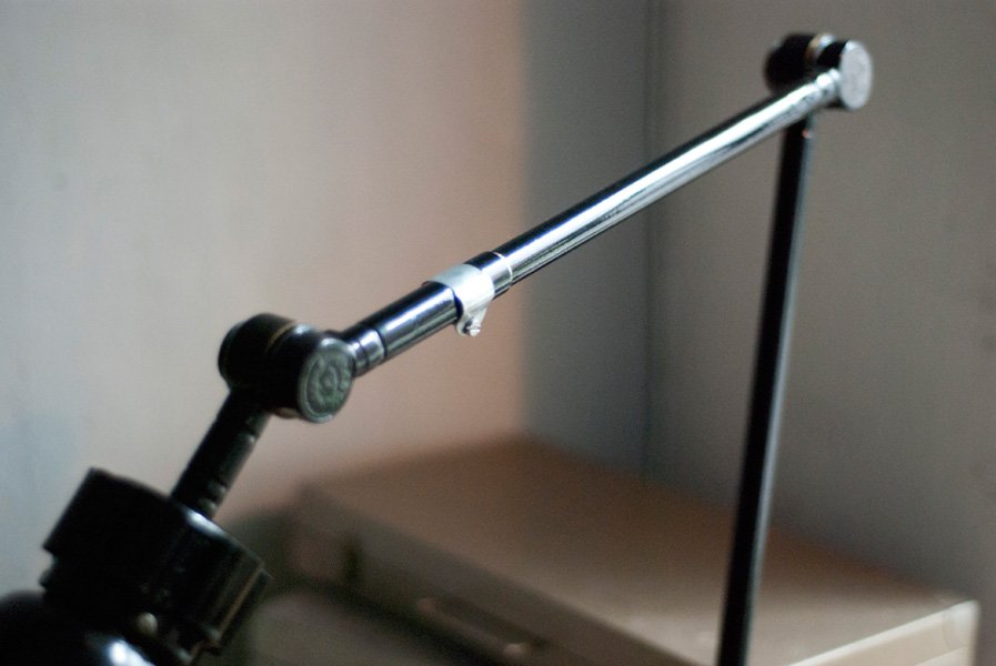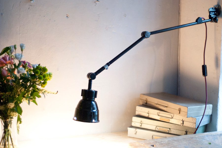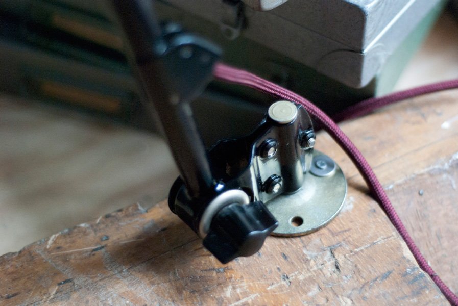 Die Halterung ist zur Verschraubung auf der Tischplatte gedacht. Die Lampe kann auch an die Wand gehängt werden.