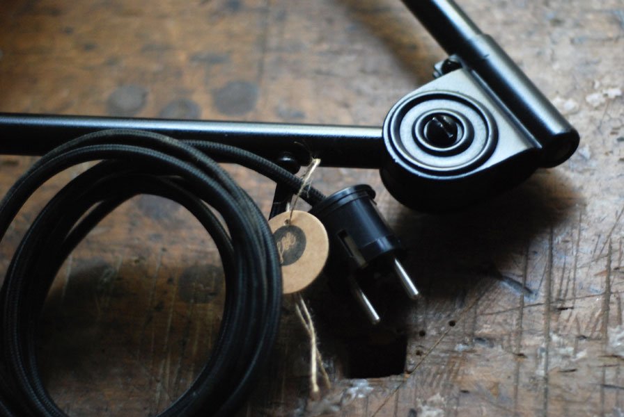 Die Elektrik wurde dreiadrig erneuert und generalüberholt. Es wurde ein schwarzes, stoffummanteltes Kabel verwendet. Die Leuchte wird mittels eines Drehschalters an der Fassung betätigt.