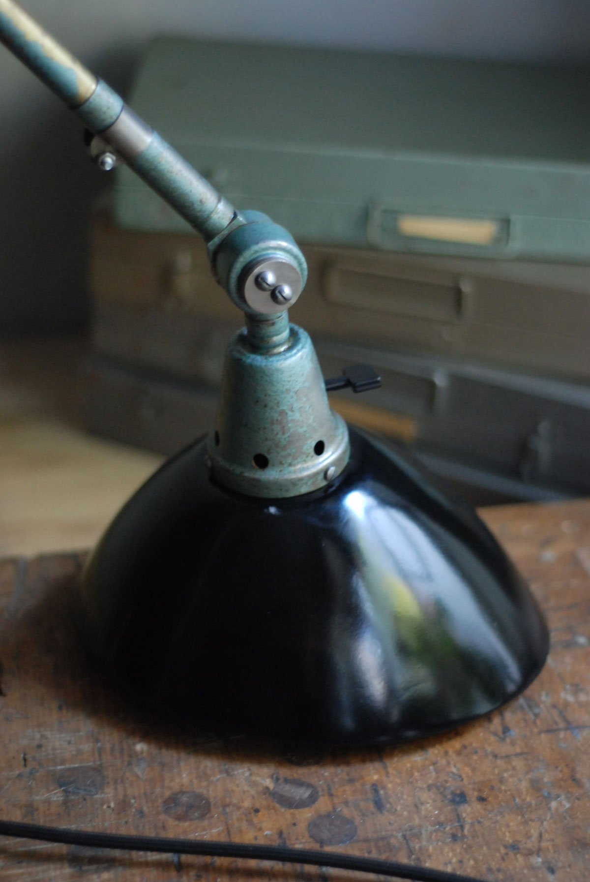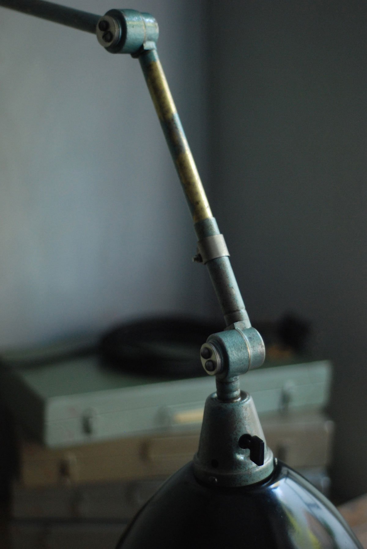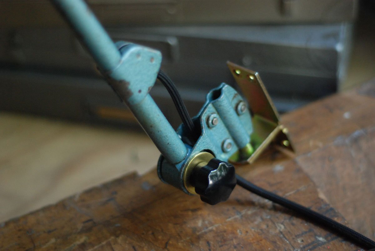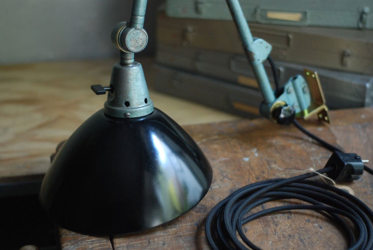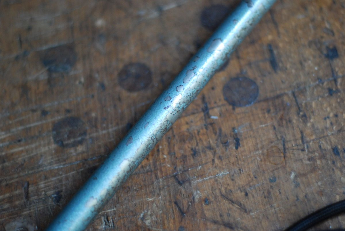 Nach der kompletten Zerlegung und sorgsamen Reinigung wurden die Elemente der Leuchte entrostet, mit Öl versiegelt und neu aufgebaut. Der schöne breite Schirm wurde in schwarz lackiert.